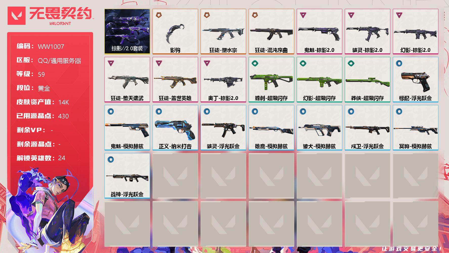 【WW1007】终极*3/卓越*6/皮肤*22/等级*59/段位:黄金/掠影//2.0套装/幻棱/炼狱/维斯/暮蝶/钛狐/壹决/铁臂/捷风/雷兹/幽影/不死鸟/贤者/猎枭/零/芮娜/奇乐/尚勃勒/霓虹/斯凯/夜露/K/O/盖可/黑梦/钢锁/近战武器-影钩/狂徒-混沌序曲/狂徒-塑水宗/狂徒-堕天遗武/狂徒-盖世英雄/幻影-掠影//2.0/幻影-超限闪存/戍卫-浮光跃金/獠犬-模拟赫兹/冥驹-模拟赫兹/莽侠-超限闪存/战神-浮光跃金/奥丁-掠影//2.0/雄鹿-模拟赫兹/骇灵-掠影//2.0/骇灵-浮光跃金/蜂刺-超限闪存/标配-浮光跃金/正义-纳米打击/鬼魅-掠影//2.0/鬼魅-模拟赫兹/终章:激斗汉堡 卡面/进入射程 卡面/《双城之战》拥抱 卡面/精灵大战 卡面/欢迎来到底城 卡面/南瓜盛典 卡面/钢弓与箭弦 卡面/排除故障 卡面/战术桌游 卡面/悠享食光 卡面/修车达人 卡面/模拟赫兹 卡面/浮光跃金 卡面/超限闪存 卡面/维斯工牌 卡面/正义的化身 卡面/Clutch 卡面/清除名单 卡面/代号红色 卡面/冰淇淋店 卡面/新兵报到 卡面/V契约 卡面/无畏契约 卡面/嗨宝南瓜灯 喷漆/嘭! 喷漆/都算到了 喷漆/控场勿近 喷漆/像素星礈 喷漆/图谋不轨的零 喷漆/小丑猫 喷漆/模拟赫兹 喷漆/高丽风情小熊 喷漆/蹲到一个 喷漆/全力集中 喷漆/超限闪存 喷漆/RUA一下 喷漆/熊抱 喷漆/高丽风情小虎 喷漆/记在小本本 喷漆/防弹企鹅 喷漆/高丽风情小蛙 喷漆/关门放狗 喷漆/松叶 喷漆/胜利属于无畏契约 喷漆/GLHF 喷漆/无畏契约 喷漆/终章:猫猫木乃伊 挂饰/悠闲鸡块 挂饰/伞绳 挂饰/《双城之战》小蛋糕 挂饰/第九季//第三幕 纪念币 挂饰/工具腰带 挂饰/暗藏猫腻 挂饰/高丽风情 挂饰/熔岩灯 挂饰/超限闪存 挂饰/迷你K/O 挂饰/模拟赫兹 挂饰/第九季//第二幕 纪念币 挂饰/《双城之战》魄罗 挂饰/无畏契约 纪念币 挂饰【账号类型: QQ】