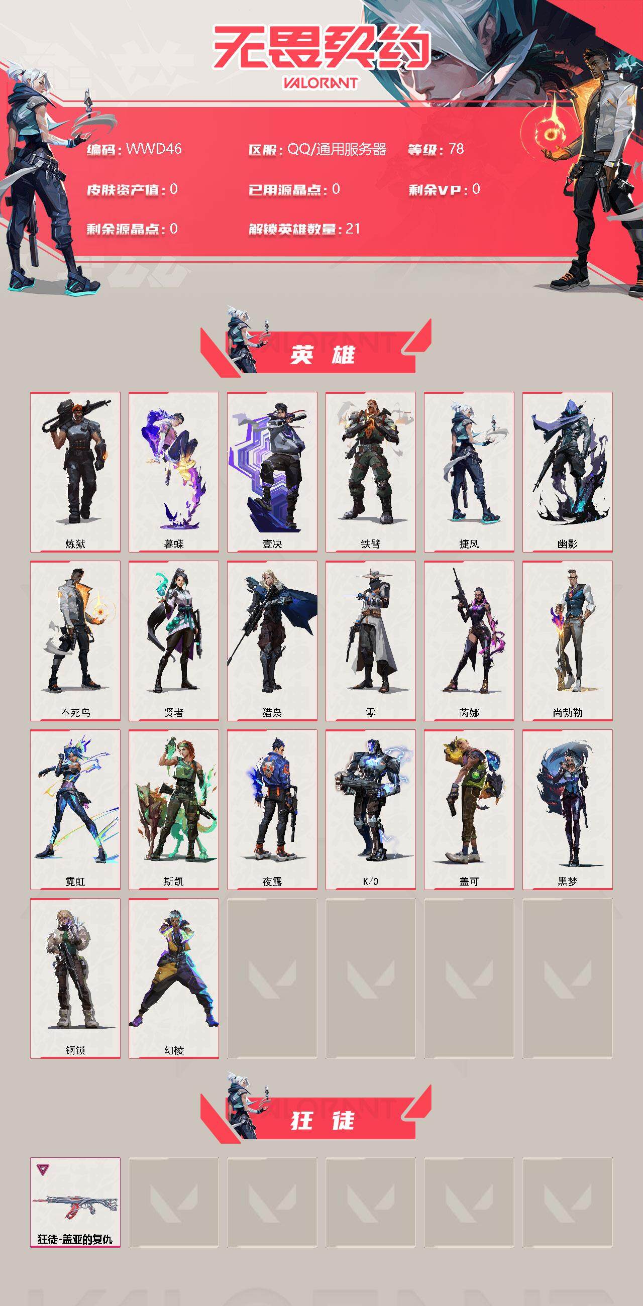 【WWD46】皮肤*4/等级*78/段位:黄金/幻棱/炼狱/暮蝶/壹决/铁臂/捷风/幽影/不死鸟/贤者/猎枭/零/芮娜/尚勃勒/霓虹/斯凯/夜露/K/O/盖可/黑梦/钢锁/狂徒-盖亚的复仇【账号类型: QQ】