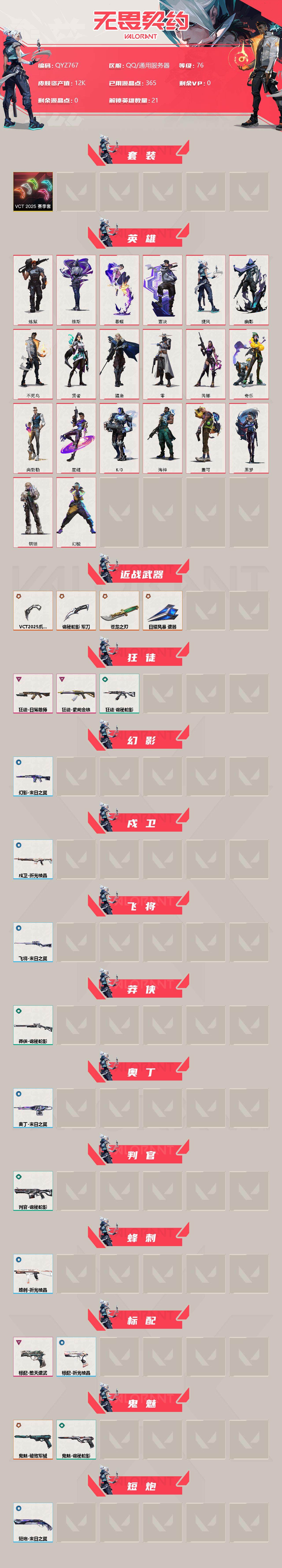 【QYZ767】终极*5/卓越*3/皮肤*32/等级*76/段位:白银/VCT 2025 赛季套装/幻棱/炼狱/维斯/暮蝶/壹决/捷风/幽影/不死鸟/贤者/猎枭/零/芮娜/奇乐/尚勃勒/星礈/K/O/海神/盖可/黑梦/钢锁/近战武器-5周年//公测重制版 苍龙之刃/近战武器-VCT 2025 爪刀/近战武器-诡秘蛇影 军刀/近战武器-日耀风暴 遗器/狂徒-日冕雄师/狂徒-紫阙金琅/狂徒-诡秘蛇影/幻影-末日之翼/戍卫-折光棱晶/飞将-末日之翼/莽侠-诡秘蛇影/奥丁-末日之翼/判官-诡秘蛇影/蜂刺-折光棱晶/标配-堕天遗武/标配-折光棱晶/鬼魅-破败军械/鬼魅-诡秘蛇影/短炮-末日之翼/树懒大作战 卡面/无畏契约GO!第一卷:芮娜 卡面/无畏契约GO!第一卷:零 卡面/钢锁vs盖可 卡面/代号红色 卡面/新兵报到 卡面/V契约 卡面/无畏契约 卡面/UWU 喷漆/买装还是存钱 喷漆/胜利属于无畏契约 喷漆/GLHF 喷漆/无畏契约 喷漆/Z世代特饮 挂饰/天外飞客 挂饰/无畏契约 纪念币 挂饰【账号类型: QQ】