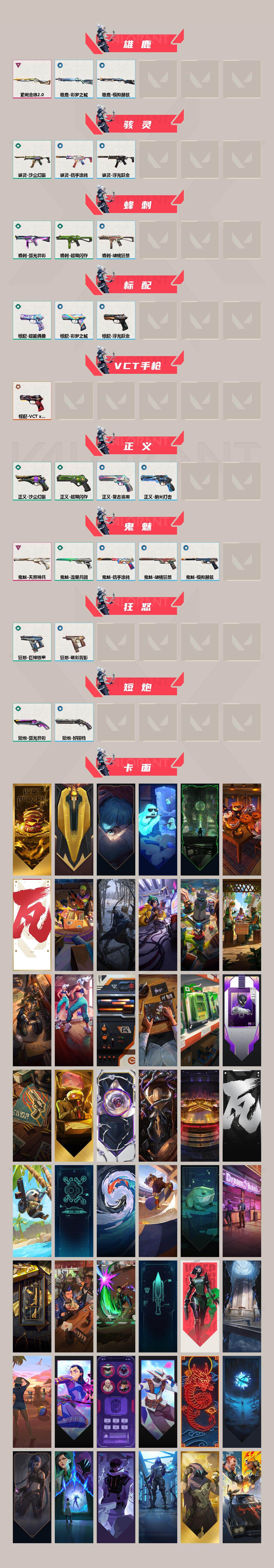 【卡面】:终章:激斗汉堡 卡面,进入射程 卡面,《双城之战》拥抱 卡面,精灵大战 卡面,欢迎来到底城 卡面,南瓜盛典 卡面,VCT CN首冠 卡面,唱片的故事 卡面,钢弓与箭弦 卡面,排除故障 卡面,战术桌游 卡面,悠享食光 卡面,修车达人 卡面,热舞环节 卡面,模拟赫兹 卡面,浮光跃金 卡面,超限闪存 卡面,维斯工牌 卡面,正义的化身 卡面,终章:生意人麦宝 卡面,铁之华 卡面,时间到 卡面,最高舞台 卡面,先瓦为敬 - 银色 卡面,树懒大作战 卡面,声感陷阱设计图 卡面,红鳞松叶 卡面,Clutch 卡面,霓帧牛蛙 卡面,梦幻奶茶 卡面,终章:打造专属狂徒 卡面,趁热吃 卡面,源能反应 卡面,零点嗅探设计图 卡面,无畏契约:蝰蛇 卡面,表象之下 卡面,沙雕爆能器 卡面,无畏契约GO!第一卷:芮娜 卡面,清除名单 卡面,无畏契约GO!第一卷:零 卡面,龍记 卡面,无垠星环 卡面,《双城之战》金克丝 卡面,蝰蛇vs幽影 卡面,逆向独行 卡面 ,暗枪 卡面,终章:黑影先生的咖啡! 卡面,铁臂vs雷兹 卡面,纪念照 P2 卡面,钢锁vs盖可 卡面,别冒尖 卡面,一击全倒 卡面,黑影先生的咖啡! 卡面,天台狂欢 卡面,胡桃狂想 卡面,沙尘幻旅 卡面,壹决工牌 卡面,萌彩剪影 卡面,势不可挡//K/O 卡面,夯实根基 卡面,"Luie" 卡面,热烈欢迎 卡面,铁臂设计图 卡面,代号红色 卡面,冰淇淋店 卡面,新兵报到 卡面,友军火力 卡面,V契约 卡面,无畏契约 卡面