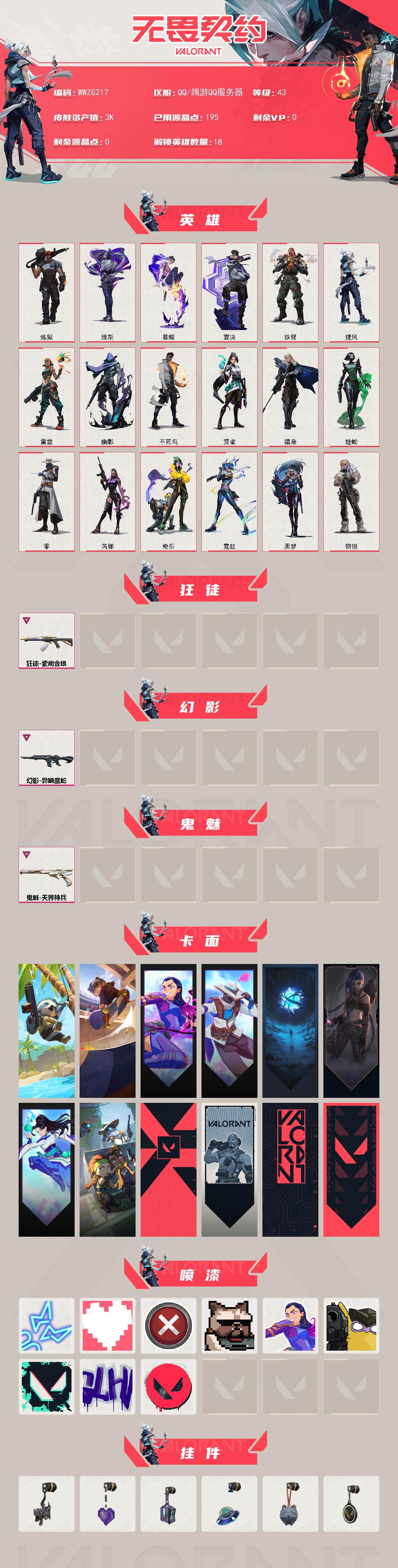 【WWZG217】卓越*3/皮肤*4/等级*43/段位:黄金/炼狱/维斯/暮蝶/壹决/铁臂/捷风/雷兹/幽影/不死鸟/贤者/猎枭/蝰蛇/零/芮娜/奇乐/霓虹/黑梦/钢锁/狂徒-紫阙金琅/幻影-异鳞魔蛇/鬼魅-天界神兵/树懒大作战 卡面/Clutch 卡面/无畏契约GO!第一卷:芮娜 卡面/无畏契约GO!第一卷:零 卡面/无垠星环 卡面/《双城之战》金克丝 卡面/无畏契约GO!第一卷:贤者 卡面/别冒尖 卡面/代号红色 卡面/新兵报到 卡面/V契约 卡面/无畏契约 卡面/霓光四射 喷漆/双击点赞 喷漆/买装还是存钱 喷漆/关门放狗 喷漆/无畏契约GO!第一卷:芮娜 喷漆/放下武器 喷漆/胜利属于无畏契约 喷漆/GLHF 喷漆/无畏契约 喷漆/鱼骨头 挂饰/薰衣草之心 挂饰/动力机箱 挂饰/天外飞客 挂饰/《双城之战》魄罗 挂饰/无畏契约 纪念币 挂饰【账号类型: QQ】