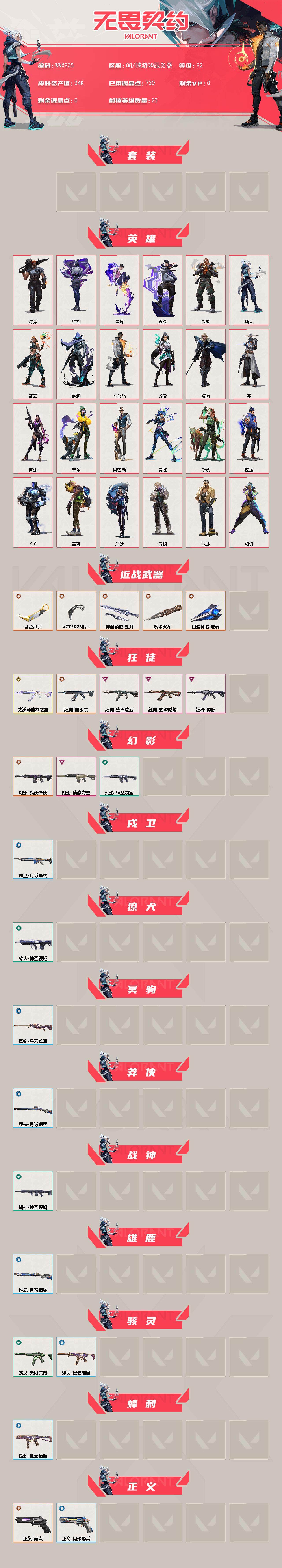 【WWX935】终极*9/传奇*1/卓越*5/皮肤*43/等级*92/段位:白银/VCT 2025 赛季套装/幻棱/炼狱/维斯/暮蝶/钛狐/壹决/铁臂/捷风/雷兹/幽影/不死鸟/贤者/猎枭/零/芮娜/奇乐/尚勃勒/霓虹/斯凯/夜露/K/O/盖可/黑梦/钢锁/近战武器-魔术火花/近战武器-VCT 2025 爪刀/近战武器-紫金爪刀/近战武器-神圣领域 战刀/近战武器-日耀风暴 遗器/狂徒-艾沃莉的梦之翼/狂徒-塑水宗/狂徒-堕天遗武/狂徒-掠影/狂徒-耀鳞威龙/幻影-黯夜怪谈/幻影-侦察力量/幻影-神圣领域/戍卫-月球哨兵/獠犬-神圣领域/冥驹-星云暗涌/莽侠-月球哨兵/战神-神圣领域/雄鹿-月球哨兵/骇灵-无限竞技/骇灵-星云暗涌/蜂刺-星云暗涌/正义-奇点/正义-月球哨兵/鬼魅-奇点//2.0/鬼魅-天界神兵/鬼魅-诡秘蛇影/鬼魅-星云暗涌/狂怒-神圣领域/精灵大战 卡面/南瓜盛典 卡面/正义的化身 卡面/树懒大作战 卡面/Clutch 卡面/聚合之力 卡面/无畏契约GO!第一卷:芮娜 卡面/无畏契约GO!第一卷:零 卡面/势不可挡//K/O 卡面/代号红色 卡面/新兵报到 卡面/V契约 卡面/无畏契约 卡面/嗨宝南瓜灯 喷漆/控场勿近 喷漆/买装还是存钱 喷漆/暴走萝莉 喷漆/胜利属于无畏契约 喷漆/GLHF 喷漆/无畏契约 喷漆/伞绳 挂饰/第九季//第三幕 纪念币 挂饰/招财猫熊 挂饰/深海水族 挂饰 /天外飞客 挂饰/《双城之战》魄罗 挂饰/无畏契约 纪念币 挂饰【账号类型: QQ】
