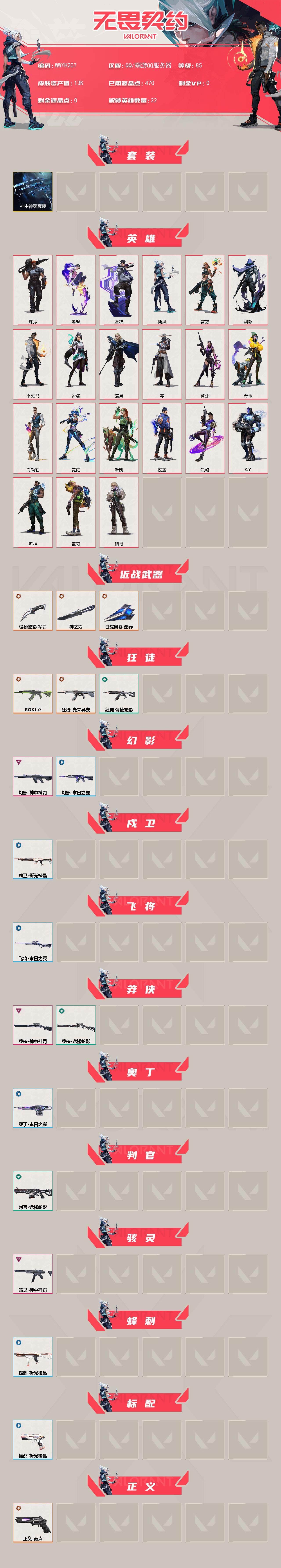 【WWYH207】终极*6/卓越*4/皮肤*35/等级*85/段位:铂金/神中神罚套装/炼狱/暮蝶/壹决/捷风/雷兹/幽影/不死鸟/贤者/猎枭/零/芮娜/奇乐/尚勃勒/霓虹/斯凯/夜露/星礈/K/O/海神/盖可/钢锁/近战武器-神之刃/近战武器-诡秘蛇影 军刀/近战武器-日耀风暴 遗器/狂徒-RGX 11z Pro/狂徒-光荣异象/狂徒-诡秘蛇影/幻影-神中神罚/幻影-末日之翼/戍卫-折光棱晶/飞将-末日之翼/莽侠-神中神罚/莽侠-诡秘蛇影/奥丁-末日之翼/判官-诡秘蛇影/骇灵-神中神罚/蜂刺-折光棱晶/标配-折光棱晶/正义-奇点/鬼魅-诡秘蛇影/狂怒-神中神罚/短炮-末日之翼/Clutch 卡面/无畏契约GO!第一卷:芮娜 卡面/无畏契约GO!第一卷:零 卡面/无垠星环 卡面/无畏契约GO!第一卷:贤者 卡面/代号红色 卡面/新兵报到 卡面/V契约 卡面/无畏契约 卡面/买装还是存钱 喷漆/胜利属于无畏契约 喷漆/GLHF 喷漆/无畏契约 喷漆/天外飞客 挂饰/《双城之战》魄罗 挂饰/无畏契约 纪念币 挂饰【账号类型: QQ】