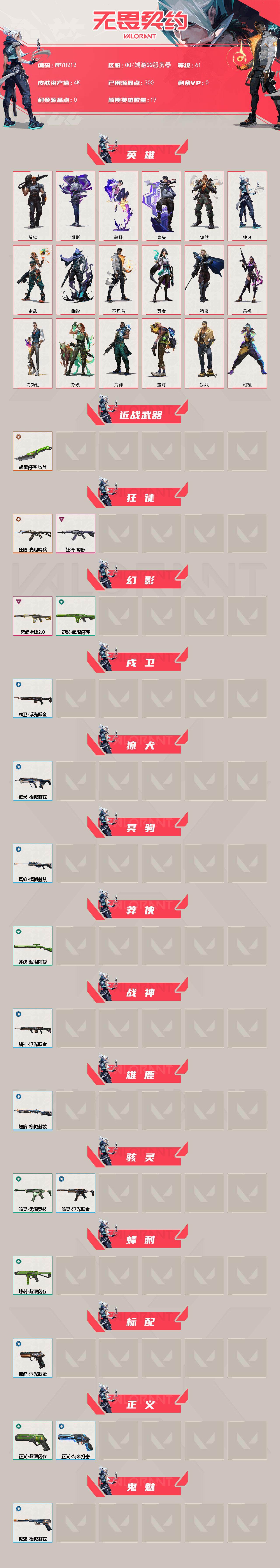 【WWYH212】终极*2/卓越*2/皮肤*18/等级*61/段位:白银/幻棱/炼狱/维斯/暮蝶/钛狐/壹决/铁臂/捷风/雷兹/幽影/不死鸟/贤者/猎枭/芮娜/尚勃勒/斯凯/海神/盖可/近战武器-超限闪存 匕首/狂徒-光明哨兵/狂徒-掠影/幻影-紫阙金琅//2.0/幻影-超限闪存/戍卫-浮光跃金/獠犬-模拟赫兹/冥驹-模拟赫兹/莽侠-超限闪存/战神-浮光跃金/雄鹿-模拟赫兹/骇灵-无限竞技/骇灵-浮光跃金/蜂刺-超限闪存/标配-浮光跃金/正义-超限闪存/正义-纳米打击/鬼魅-模拟赫兹/终章:激斗汉堡 卡面/进入射程 卡面/《双城之战》拥抱 卡面/精灵大战 卡面/欢迎来到底城 卡面/南瓜盛典 卡面/VCT CN首冠 卡面/唱片的故事 卡面/钢弓与箭弦 卡面/排除故障 卡面/战术桌游 卡面/悠享食光 卡面/修车达人 卡面/模拟赫兹 卡面/浮光跃金 卡面/超限闪存 卡面/维斯工牌 卡面/正义的化身 卡面/无畏契约GO!第一卷:芮娜 卡面/无畏契约GO!第一卷:零 卡面/别冒尖 卡面/代号红色 卡面/新兵报到 卡面/V契约 卡面/无畏契约 卡面/嗨宝南瓜灯 喷漆/嘭! 喷漆/都算到了 喷漆/控场勿近 喷漆/皮蛋呼呼 喷漆/像素星礈 喷漆/图谋不轨的零 喷漆/小丑猫 喷漆/模拟赫兹 喷漆/高丽风情小熊 喷漆/蹲到一个 喷漆/全力集中 喷漆/超限闪存 喷漆/RUA一下 喷漆/熊抱 喷漆/高丽风情小虎 喷漆/记在小本本 喷漆/防弹企鹅 喷漆/高丽风情小蛙 喷漆/捷风差距 喷漆/买装还是存钱 喷漆/胜利属于无畏契约 喷漆/GLHF 喷漆/无畏契约 喷漆/终章:猫猫木乃伊 挂饰/悠闲鸡块 挂饰/伞绳 挂饰/《双城之战》小蛋糕 挂饰/第九季//第三幕 纪念币 挂饰/拳击战术熊 挂饰/工具腰带 挂饰/无畏契约GO!第一卷 芮娜 挂饰/无畏契约GO!第一卷 零 挂饰/暗藏猫腻 挂饰/高丽风情 挂饰/熔岩灯 挂饰/超限闪存 挂饰/迷你K/O 挂饰/模拟赫兹 挂饰/第九季//第二幕 纪念币 挂饰/薰衣草之心 挂饰/Z世代特饮 挂饰/天外飞客 挂饰/《双城之战》魄罗 挂饰/插电音乐 挂饰/无畏契约 纪念币 挂饰【账号类型: QQ】