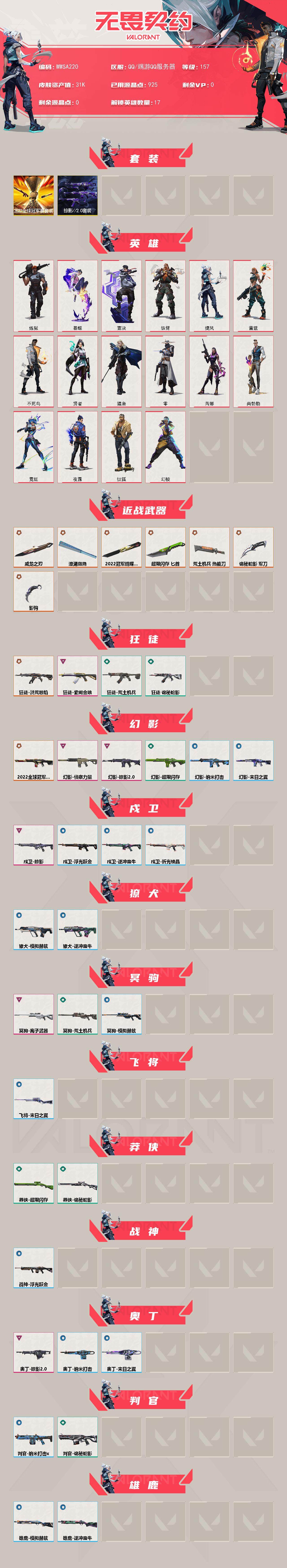 【WWSA220】终极*12/卓越*9/皮肤*60/等级*157/段位:钻石/2022全球冠军赛套装/掠影//2.0套装/幻棱/炼狱/暮蝶/钛狐/壹决/铁臂/捷风/雷兹/不死鸟/贤者/猎枭/零/芮娜/尚勃勒/霓虹/夜露/近战武器-2022全球冠军赛 蝴蝶刀/近战武器-影钩/近战武器-威龙之刃/近战武器-澄湖潋滟/近战武器-超限闪存 匕首/近战武器-荒土机兵 热能刀/近战武器-诡秘蛇影 军刀/狂徒-洪荒怒焰/狂徒-紫阙金琅/狂徒-荒土机兵/狂徒-诡秘蛇影/幻影-2022全球冠军赛/幻影-侦察力量/幻影-掠影//2.0/幻影-超限闪存/幻影-纳米打击/幻影-末日之翼/戍卫-掠影/戍卫-浮光跃金/戍卫-逆冲蛮牛/戍卫-折光棱晶/獠犬-模拟赫兹/獠犬-逆冲蛮牛/冥驹-离子武器/冥驹-荒土机兵/冥驹-模拟赫兹/飞将-末日之翼/莽侠-超限闪存/莽侠-诡秘蛇影/战神-浮光跃金/奥丁-掠影//2.0/奥丁-纳米打击/奥丁-末日之翼/判官-诡秘蛇影/判官-纳米打击x/雄鹿-模拟赫兹/雄鹿-逆冲蛮牛/骇灵-掠影//2.0/骇灵-荒土机兵/骇灵-浮光跃金/蜂刺-超限闪存/蜂刺-折光棱晶/标配-荒土机兵/标配-浮光跃金/标配-折光棱晶/标配-VCT25 x EDG/正义-奇点/正义-西部未来/正义-超限闪存/正义-纳米打击/鬼魅-天界神兵/鬼魅-掠影//2.0/鬼魅-诡秘蛇影/鬼魅-模拟赫兹/鬼魅-星云暗涌/狂怒-逆冲蛮牛/短炮-末日之翼/终章:激斗汉堡 卡面/进入射程 卡面/分崩离析 卡面/纳米打击 卡面/抑制技术 卡面/激斗汉堡 卡面/瓦娃脸雪糕 P2 卡面/从黄昏到黎明 卡面/荒土机兵 卡面/银弹猎手 卡面/逆冲蛮牛 卡面/《双城之战》拥抱 卡面/精灵大战 卡面/欢迎来到底城 卡面/南瓜盛典 卡面/唱片的故事 卡面/钢弓与箭弦 卡面/排除故障 卡面/战术桌游 卡面/悠享食光 卡面/修车达人 卡面/模拟赫兹 卡面/浮光跃金 卡面/超限闪存 卡面/维斯工牌 卡面/正义的化身 卡面/无畏契约GO!第一卷:芮娜 卡面/无畏契约GO!第一卷:零 卡面/《双城之战》金克丝 卡面/钢锁vs盖可 卡面/别冒尖 卡面/夯实根基 卡面/代号红色 卡面/新兵报到 卡面/V契约 卡面/无畏契约 卡面/小小心意 喷漆/战“素”兔 喷漆/宇宙的指引 喷漆/请求重启 喷漆/逆冲蛮牛 喷漆/纳米打击 喷漆/鼻尖上的蝴蝶 喷漆/简笔画黯兽 喷漆/独守蝰腹 喷漆/他们将落荒而逃 喷漆/通缉:战术企鹅 喷漆/荒土机兵 喷漆/别挡我吃球! 喷漆/嗨宝南瓜灯 喷漆/嘭! 喷漆/都算到了 喷漆/控场勿近 喷漆/皮蛋呼呼 喷漆/像素星礈 喷漆/图谋不轨的零 喷漆/小丑猫 喷漆/模拟赫兹 喷漆/高丽风情小熊 喷漆/蹲到一个 喷漆/全力集中 喷漆/超限闪存 喷漆/RUA一下 喷漆/熊抱 喷漆/高丽风情小虎 喷漆/记在小本本 喷漆/防弹企鹅 喷漆/高丽风情小蛙 喷漆/审判之爪 喷漆/买装还是存钱 喷漆/关门放狗 喷漆/酷熊冲浪 喷漆/松叶 喷漆/放下武器 喷漆/胜利属于无畏契约 喷漆/GLHF 喷漆/无畏契约 喷漆/终章:猫猫木乃伊 挂饰/荒土机兵 挂饰/悠闲鸡块 挂饰/猫猫木乃伊 挂饰/水壶 挂饰/纳米打击 挂饰/逆冲蛮牛 挂饰/可爱糖糖 挂饰/伞绳 挂饰/《双城之战》小蛋糕 挂饰/第九季//第三幕 纪念币 挂饰/拳击战术熊 挂饰/工具腰带 挂饰/无畏契约GO!第一卷 芮娜 挂饰/无畏契约GO!第一卷 零 挂饰/暗藏猫腻 挂饰/高丽风情 挂饰/熔岩灯 挂饰/超限闪存 挂饰/迷你K/O 挂饰/模拟赫兹 挂饰/第九季//第二幕 纪念币 挂饰/薰衣草之心 挂饰/Z世代特饮 挂饰/VCT x EDG 挂饰/天外飞客 挂饰/无畏契约 纪念币 挂饰【账号类型: QQ】