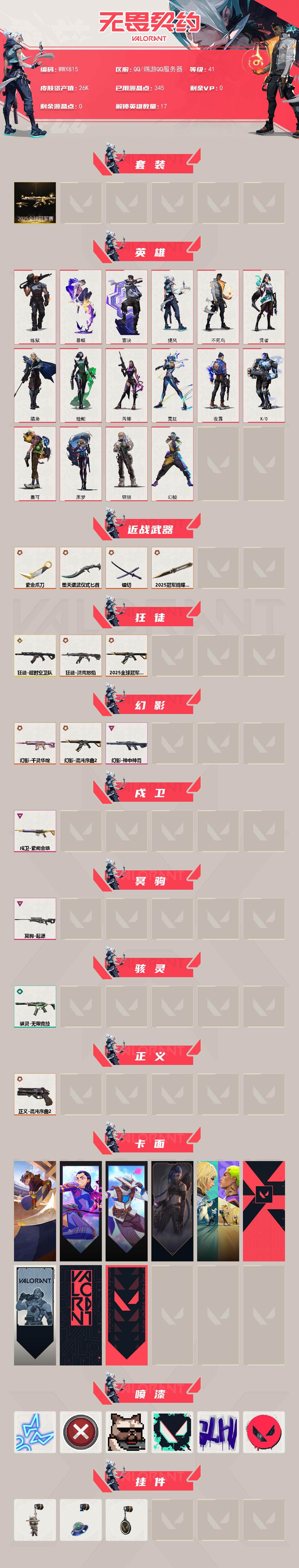 【WWX815】终极*10/传奇*1/卓越*3/皮肤*32/等级*41/段位:黄金/2025全球冠军赛套装/幻棱/炼狱/暮蝶/壹决/捷风/不死鸟/贤者/猎枭/蝰蛇/芮娜/霓虹/夜露/K/O/盖可/黑梦/钢锁/近战武器-2025全球冠军赛 蝴蝶刀/近战武器-紫金爪刀/近战武器-镭切/近战武器-堕天遗武 仪式匕首/狂徒-超时空卫队/狂徒-2025全球冠军赛/狂徒-洪荒怒焰/幻影-千灵华绽/幻影-混沌序曲//2.0/幻影-神中神罚/戍卫-紫阙金琅/冥驹-起源/骇灵-无限竞技/正义-混沌序曲//2.0/Clutch 卡面/无畏契约GO!第一卷:芮娜 卡面/无畏契约GO!第一卷:零 卡面/《双城之战》金克丝 卡面/钢锁vs盖可 卡面/代号红色 卡面/新兵报到 卡面/V契约 卡面/无畏契约 卡面/霓光四射 喷漆/买装还是存钱 喷漆/关门放狗 喷漆/胜利属于无畏契约 喷漆/GLHF 喷漆/无畏契约 喷漆/无畏契约GO!第一卷 零 挂饰/天外飞客 挂饰/无畏契约 纪念币 挂饰【账号类型: QQ】