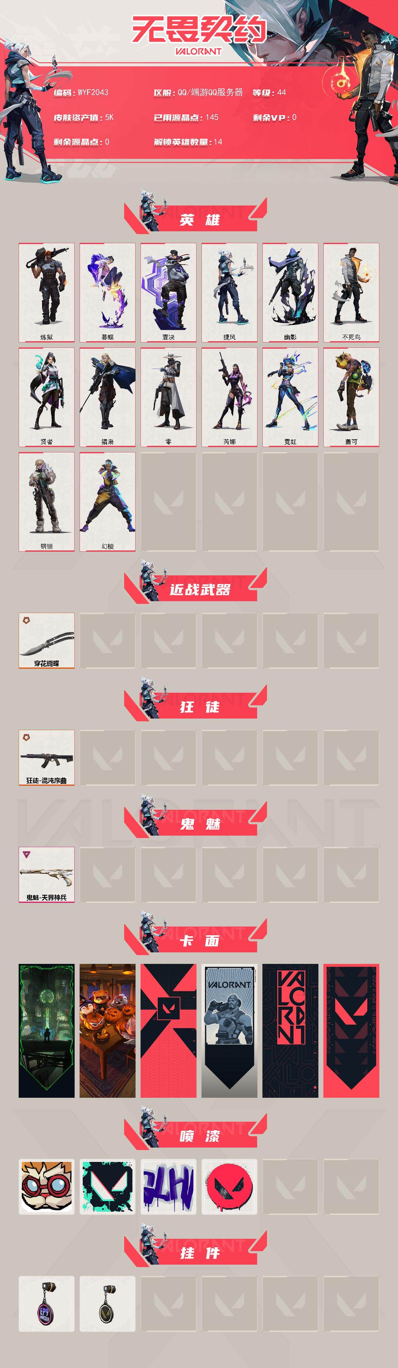 【WYF2043】终极*2/卓越*1/皮肤*4/等级*44/段位:青铜/幻棱/炼狱/暮蝶/壹决/捷风/幽影/不死鸟/贤者/猎枭/零/芮娜/霓虹/盖可/钢锁/近战武器-穿花蝴蝶/狂徒-混沌序曲/鬼魅-天界神兵/欢迎来到底城 卡面/南瓜盛典 卡面/代号红色 卡面/新兵报到 卡面/V契约 卡面/无畏契约 卡面/都算到了 喷漆/胜利属于无畏契约 喷漆/GLHF 喷漆/无畏契约 喷漆/第九季//第三幕 纪念币 挂饰/无畏契约 纪念币 挂饰【账号类型: QQ】