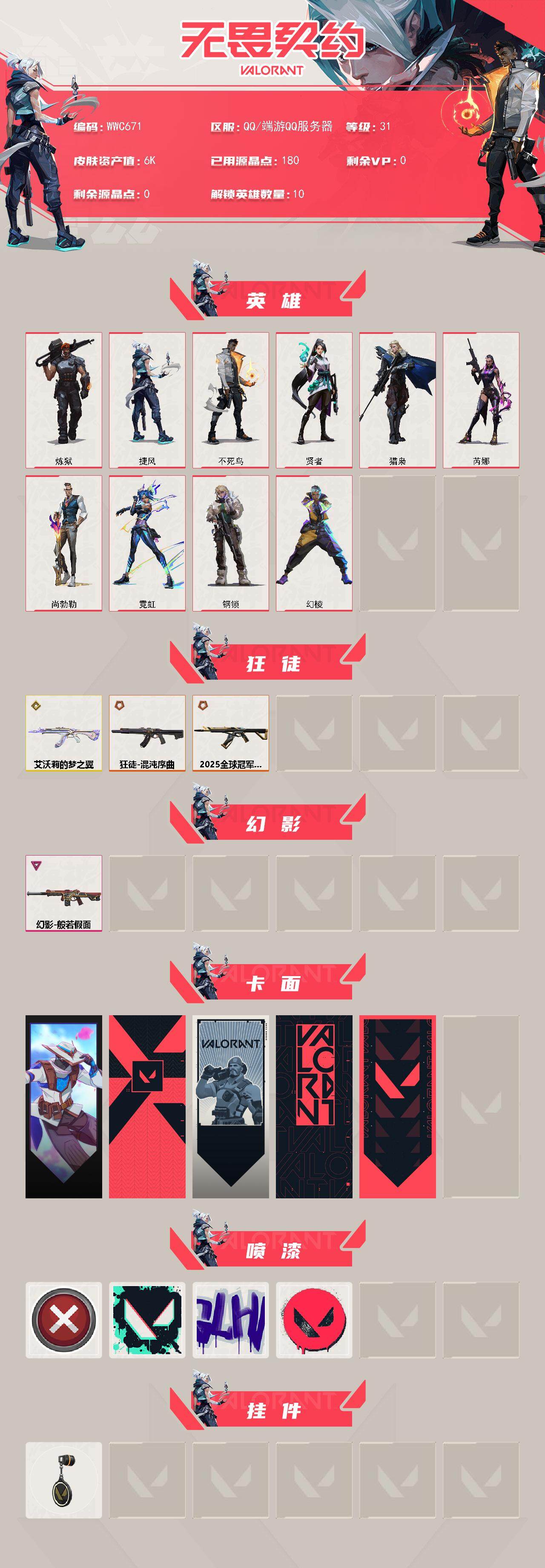 【WWC671】终极*2/传奇*1/卓越*1/皮肤*8/等级*31/段位:黑铁/幻棱/炼狱/捷风/不死鸟/贤者/猎枭/芮娜/尚勃勒/霓虹/钢锁/狂徒-艾沃莉的梦之翼/狂徒-2025全球冠军赛/狂徒-混沌序曲/幻影-般若假面/无畏契约GO!第一卷:零 卡面/代号红色 卡面/新兵报到 卡面/V契约 卡面/无畏契约 卡面/买装还是存钱 喷漆/胜利属于无畏契约 喷漆/GLHF 喷漆/无畏契约 喷漆/无畏契约 纪念币 挂饰【账号类型: QQ】