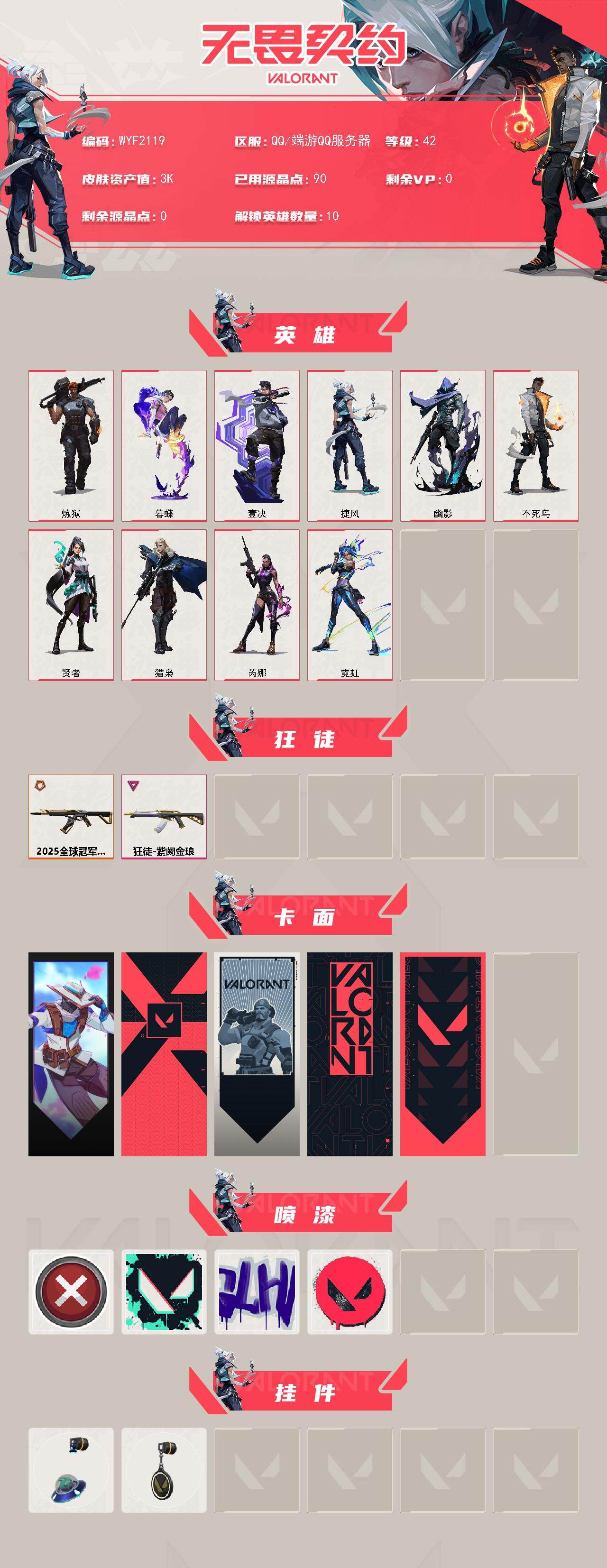 【WYF2119】终极*1/卓越*1/皮肤*2/等级*42/段位:黄金/炼狱/暮蝶/壹决/捷风/幽影/不死鸟/贤者/猎枭/芮娜/霓虹/狂徒-2025全球冠军赛/狂徒-紫阙金琅/无畏契约GO!第一卷:零 卡面/代号红色 卡面/新兵报到 卡面/V契约 卡面/无畏契约 卡面/买装还是存钱 喷漆/胜利属于无畏契约 喷漆/GLHF 喷漆/无畏契约 喷漆/天外飞客 挂饰/无畏契约 纪念币 挂饰【账号类型: QQ】