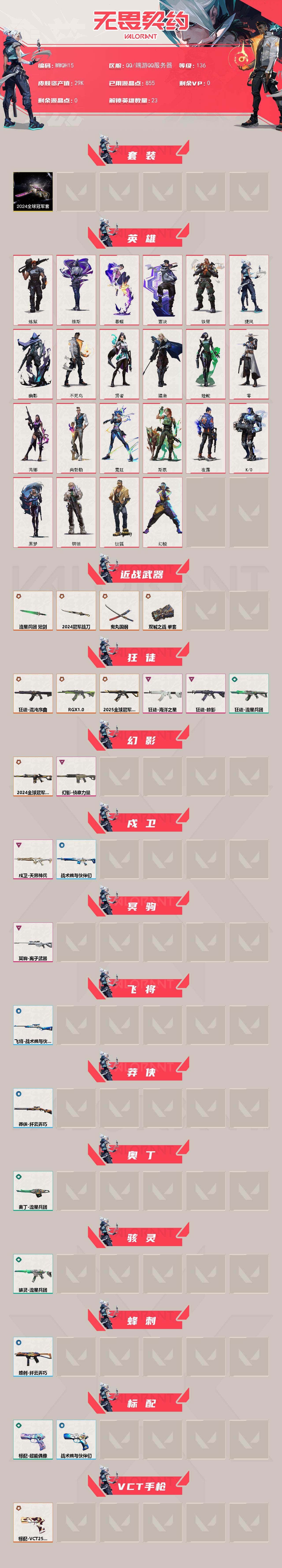 【WWQH15】终极*10/传奇*1/卓越*5/皮肤*43/等级*136/段位:钻石/2024全球冠军赛套装/幻棱/炼狱/维斯/暮蝶/钛狐/壹决/铁臂/捷风/幽影/不死鸟/贤者/猎枭/蝰蛇/零/芮娜/尚勃勒/霓虹/斯凯/夜露/K/O/黑梦/钢锁/近战武器-2024全球冠军赛 战刀/近战武器-鬼丸国纲/近战武器-双城之战 拳套/近战武器-流星兵团 短剑/狂徒-2025全球冠军赛/狂徒-混沌序曲/狂徒-RGX 11z Pro/狂徒-掠影/狂徒-海洋之星/狂徒-流星兵团/幻影-2024全球冠军赛/幻影-侦察力量/戍卫-天界神兵/戍卫-战术熊与伙伴们/冥驹-离子武器/飞将-战术熊与伙伴们/莽侠-纤云弄巧/奥丁-流星兵团/骇灵-流星兵团/蜂刺-纤云弄巧/标配-超能偶像/标配-战术熊与伙伴们/标配-VCT25 x G2/正义-西部未来/正义-超限闪存/正义-纳米打击/正义-纤云弄巧/正义-游戏结束/鬼魅-超时空卫队/鬼魅-流星兵团/狂怒-战术熊与伙伴们/短炮-纤云弄巧/终章:激斗汉堡 卡面/进入射程 卡面/《双城之战》拥抱 卡面/精灵大战 卡面/欢迎来到底城 卡面/南瓜盛典 卡面/VCT CN首冠 卡面/修车达人 卡面/正义的化身 卡面/终章:生意人麦宝 卡面/铁之华 卡面/2024全球冠军赛 卡面/时间到 卡面/最高舞台 卡面/音熊登场 卡面/树懒大作战 卡面/声感陷阱设计图 卡面/红鳞松叶 卡面/梦幻奶茶 卡面/终章:打造专属狂徒 卡面/趁热吃 卡面/西装暴徒 卡面/失控边缘 卡面/哨卫者之领域 卡面/暮蝶工牌 卡面/战术熊与伙伴们 卡面/源能反应 卡面/流星兵团 卡面/纤云弄巧 卡面/暂别喧嚣 卡面/打造专属狂徒 卡面/零点嗅探设计图 卡面/沙雕爆能器 卡面/无畏契约GO!第一卷:芮娜 卡面/清除名单 卡面/无畏契约GO!第一卷:零 卡面/无垠星环 卡面/《双城之战》金克丝 卡面/暗枪 卡面/铁臂设计图 卡面/代号红色 卡面/冰淇淋店 卡面/新兵报到 卡面/友军火力 卡面/V契约 卡面/无畏契约 卡面/嗨宝南瓜灯 喷漆/嘭! 喷漆/都算到了 喷漆/控场勿近 喷漆/小丑猫 喷漆/熊抱 喷漆/蛋糕还是爆能器? 喷漆/2024全球冠军赛 喷漆/超级粉丝 喷漆/捷风差距 喷漆/惊声尖叫 喷漆/2021冠军巡回赛花火 喷漆/战术熊的巴拉莱卡琴 喷漆/拼一枪 喷漆/加油!加油! 喷漆/开心到爆炸 喷漆/皮蛋萌舞 喷漆/我觉得不行 喷漆/头号粉丝 喷漆/吸一口快乐 喷漆/永远的答案 喷漆/再来一次? 喷漆/别挡我的路! 喷漆/我的刀呢? 喷漆/当然可以 喷漆/流星兵团 喷漆/战术熊与伙伴们 喷漆/禁止喷漆 喷漆/纤云弄巧 喷漆/UWU 喷漆/新潮流 喷漆/VCT x G2 喷漆/双击点赞 喷漆/买装还是存钱 喷漆/醒狮贺春 喷漆/松叶 喷漆/蕊形灯 喷漆/胜利属于无畏契约 喷漆/GLHF 喷漆/无畏契约 喷漆/终章:猫猫木乃伊 挂饰/悠闲鸡块 挂饰/伞绳 挂饰/《双城之战》小蛋糕 挂饰/第九季//第三幕 纪念币 挂饰/工具腰带 挂饰/无畏契约GO!第一卷 芮娜 挂饰/无畏契约GO!第一卷 零 挂饰/鱼骨头 挂饰/熔岩灯 挂饰/第九季//第二幕 纪念币 挂饰/终章:这瓜保熟 挂饰/2024全球冠军赛 挂饰/糖葫芦 挂饰/袖珍捷风 挂饰/丢麦 挂饰/迷你浓缩 挂饰/尤克里里 挂饰/Z世代特饮 挂饰/第九季//第一幕 纪念币 挂饰/第八季:白银 挂饰/终章:迷你机甲 挂饰/犯困的布鲁诺 挂饰/战术河童 挂饰/招财猫熊 挂饰/迷你机甲 挂饰/荧光棒 挂饰/章鱼烧先生 挂饰/流星兵团 挂饰/云开见日 挂饰/第八季//第三幕 纪念币 挂饰/传世莲华 挂饰/VCT x G2 挂饰/第八季//第二幕 纪念币 挂饰 /天外飞客 挂饰/好运福爪 挂饰/第八季//第一幕 纪念币 挂饰/无畏契约 纪念币 挂饰【账号类型: QQ】