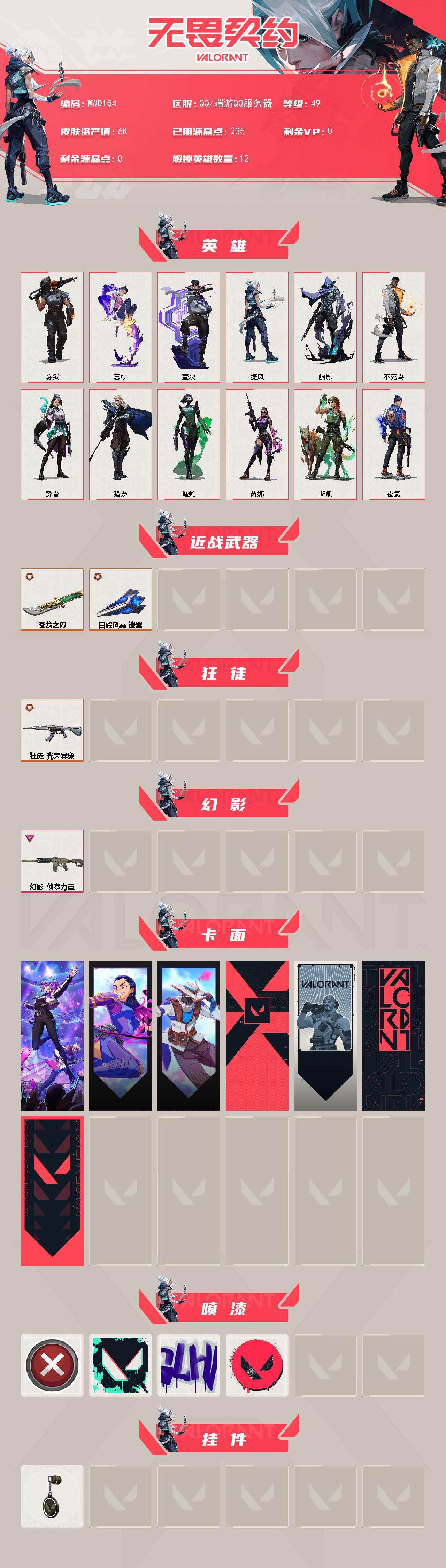 【WWD154】终极*3/卓越*1/皮肤*17/等级*49/段位:铂金/炼狱/暮蝶/壹决/捷风/幽影/不死鸟/贤者/猎枭/蝰蛇/芮娜/斯凯/夜露/近战武器-5周年//公测重制版 苍龙之刃/近战武器-日耀风暴 遗器/狂徒-光荣异象/幻影-侦察力量/超能偶像 卡面/无畏契约GO!第一卷:芮娜 卡面/无畏契约GO!第一卷:零 卡面/代号红色 卡面/新兵报到 卡面/V契约 卡面/无畏契约 卡面/买装还是存钱 喷漆/胜利属于无畏契约 喷漆/GLHF 喷漆/无畏契约 喷漆/无畏契约 纪念币 挂饰【账号类型: QQ】