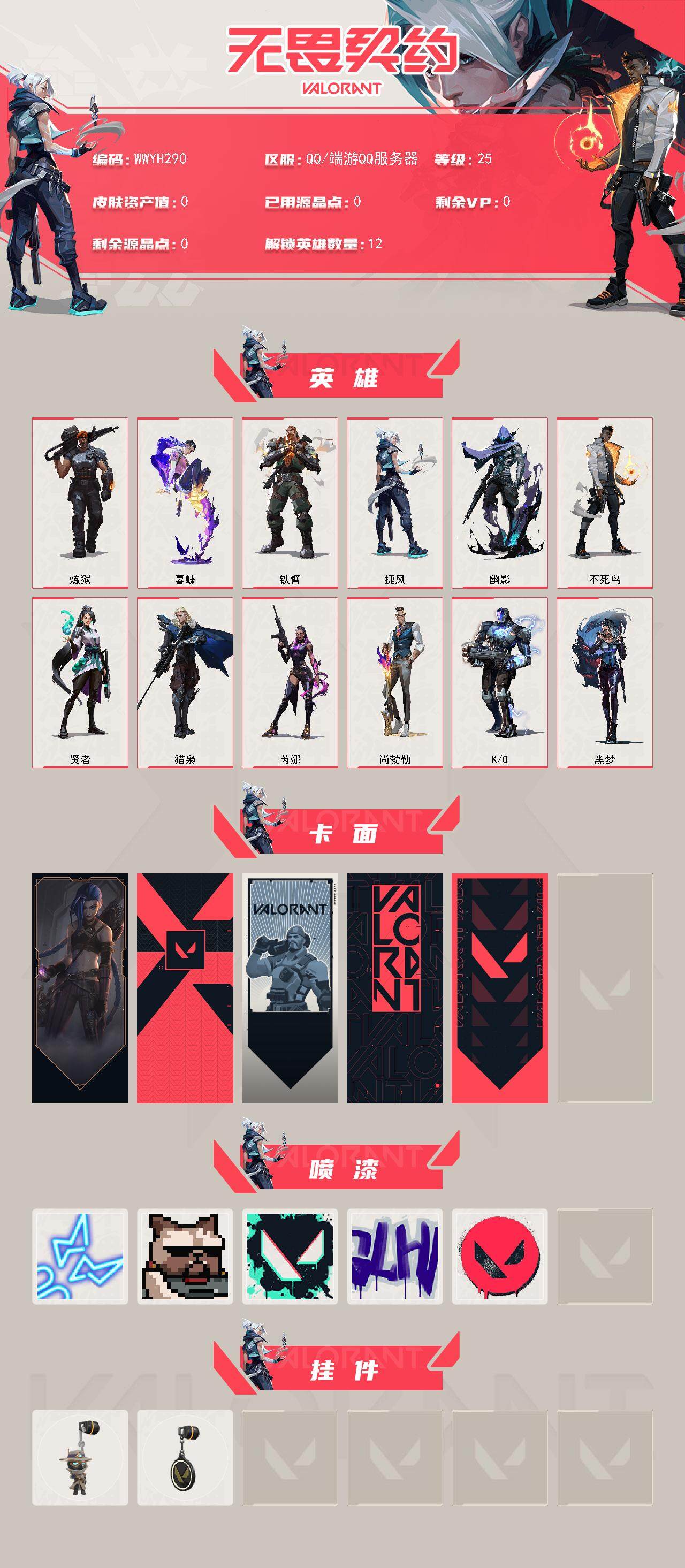 【WWYH290】皮肤*1/等级*25/段位:白银/炼狱/暮蝶/铁臂/捷风/幽影/不死鸟/贤者/猎枭/芮娜/尚勃勒/K/O/黑梦/《双城之战》金克丝 卡面/代号红色 卡面/新兵报到 卡面/V契约 卡面/无畏契约 卡面/霓光四射 喷漆/关门放狗 喷漆/胜利属于无畏契约 喷漆/GLHF 喷漆/无畏契约 喷漆/无畏契约GO!第一卷 零 挂饰/无畏契约 纪念币 挂饰【账号类型: QQ】