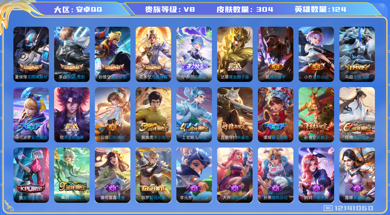 [12141060]【金标项羽 金标李白 金标夏侯惇】实名: 可修改 贵族等级: V8 英雄数: 125 皮肤数: 304 荣耀水晶: 无限飓风号,鸣剑·曳影,全息碎影,九霄神辉 无双皮: 小乔时之魔女 传说皮: 黄金狮子座,绛天战甲,音你心动-小乔,无双飞将,妄想实况,铠冥王哈迪斯,幻光神枪 限定皮: 李小龙,梁祝,美猴王,朱雀志,霸王别姬-虞姬,高山流水,匿光追影者,鸣野蒿【实名情况: 可二次实名】