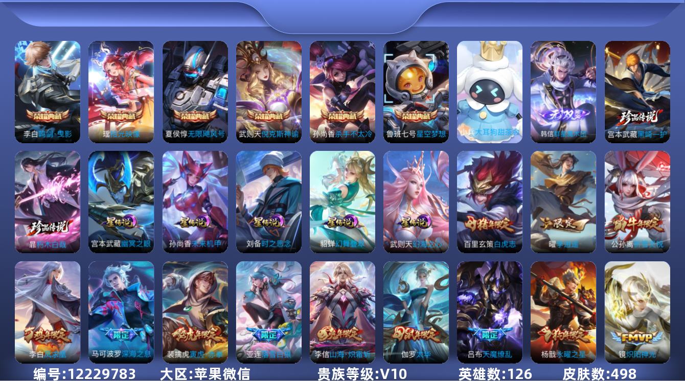 史诗限定:寅虎·御盾,白晶晶,御风骁将,霸王别姬-项羽,冰锋战神,百相守梦(关羽),青春决赛季,瑞麟志,默契交锋-花木兰,神威,引擎之心,龙胆,岱宗,飞衡,至尊宝,大圣娶亲,青龙志,梅西,时之祈愿-云中君,鹤归松栖(赵怀真),时之彼端,雪夜绮愿(周瑜),幽恒,魔法小厨娘,凤凰于飞,寅虎·心曲,冰霜恋舞曲,神器·万象笔,如梦令-嫦娥,山海·玄木吟,辉光之辰,如梦令-后羿,霸王别姬-虞姬,烈魂,朱雀志,琥珀纪元伽罗,云端筑梦师,玄嵩,寅虎·展翼,奔雷神使,虎魄,奇迹圣诞,玄武志,天狼征服者,逐梦之翼,一生所爱,神奇女侠,天狼狩猎者,匿光追影者,逐梦之音,匿光破解者,天狼绘梦者,逐梦之星,匿光侦查者,天狼运算者,逐梦之光,【实名情况: 不可二次实名】