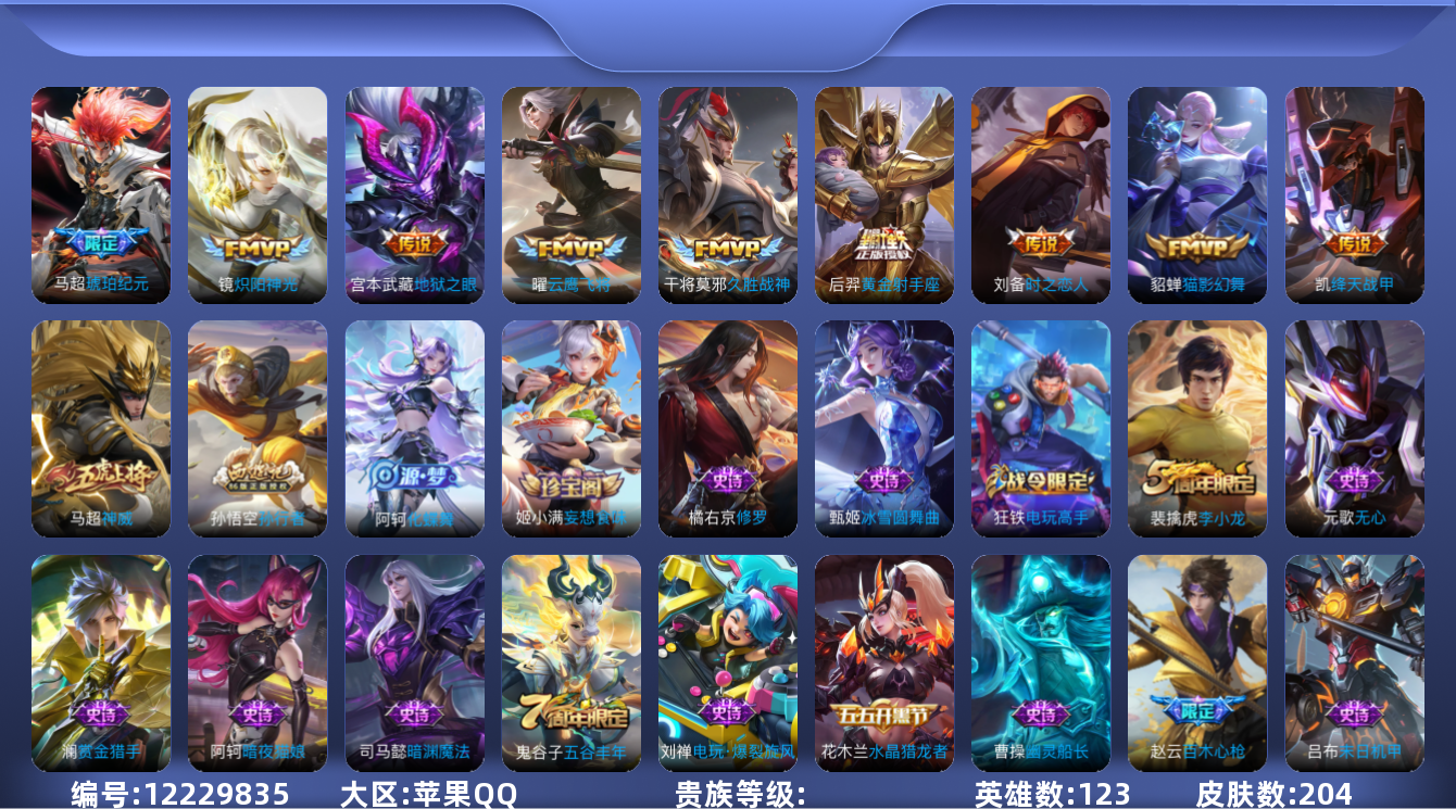 [12229835]HW8386【商品标题】:苹果Q-V6-至尊星耀V-123英雄-204皮肤-0典藏-0无双-0珍品传说-9传说-44史诗