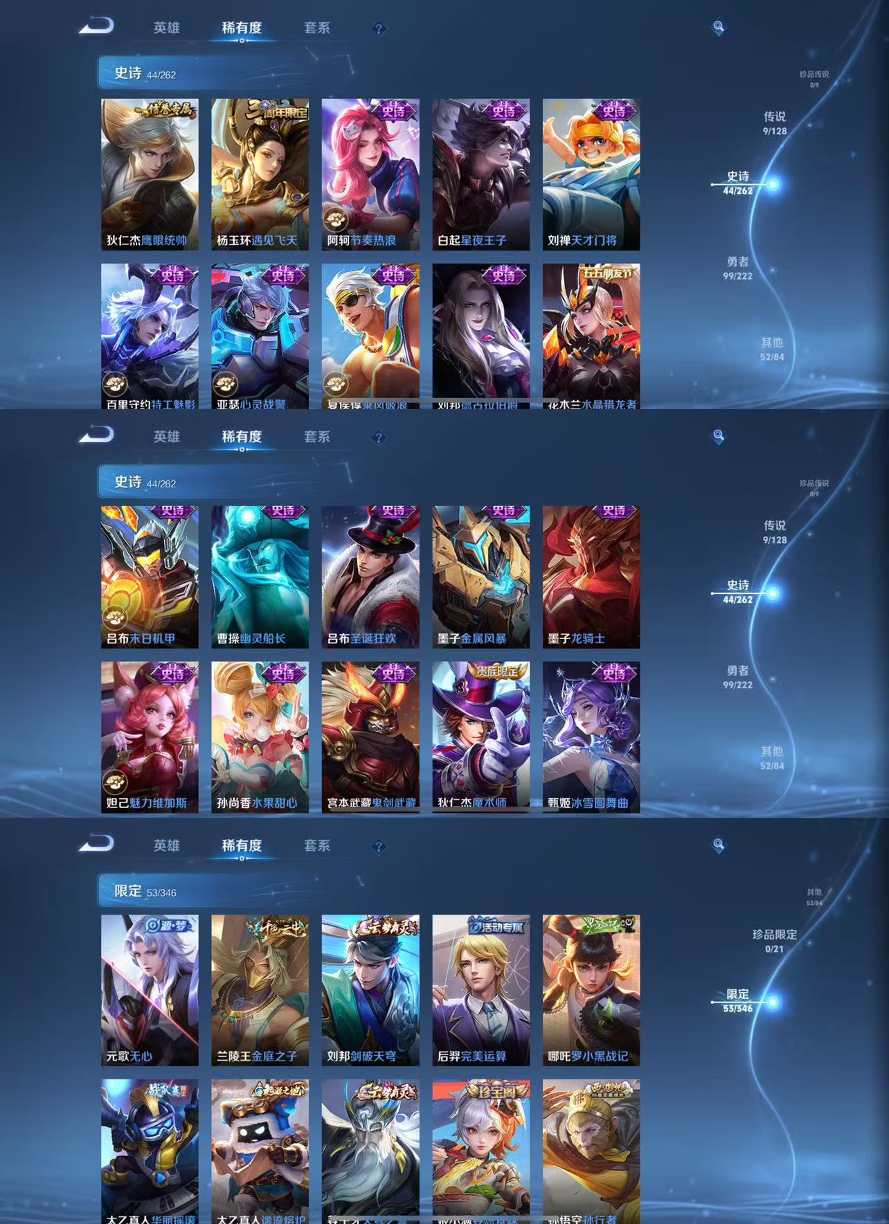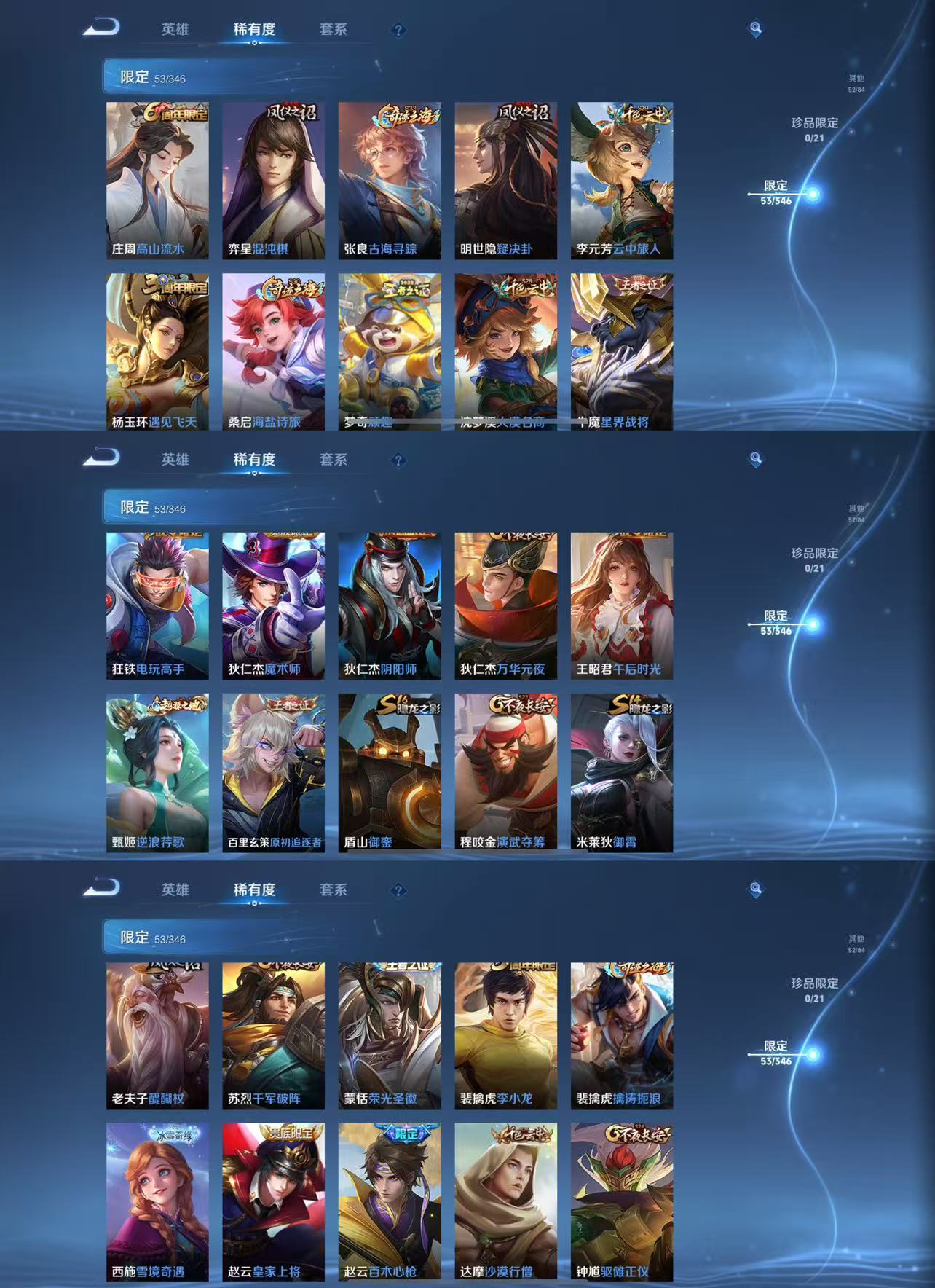 【赛季限定】 米莱狄御霄 盾山御銮 明世隐疑决卦 老夫子醍醐杖 鬼谷子原初探秘者 狄仁杰万华元夜 程咬金演武夺筹 钟馗驱傩正仪 苏烈千军破阵 奕星混沌棋 达摩沙漠行僧 兰陵王金庭之子 沈梦溪大漠名商 李元芳云中旅人 桑启海盐诗旅 梦奇顽趣 裴擒虎擒涛扼浪 鲁班大师探海日志 张良古海寻踪 鬼谷子天穹祈灯 刘邦剑破天穹