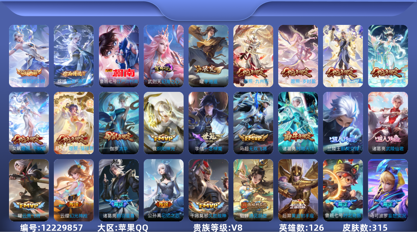 【传说皮肤】 后羿黄金射手座 花木兰冠军飞将 干将莫邪久胜战神 铠绛天战甲 曜云鹰飞将 镜炽阳神光 李信一念神魔 武则天海洋之心 曜李逍遥 马超无双飞将 公孙离记忆之芯 诸葛亮鹤羽星尊 东皇太一灼幽烈阳 鲁班七号时之奇旅 诸葛亮时雨天司 伽罗太华 兰陵王默契交锋 诸葛亮武陵仙君 虞姬启明星使