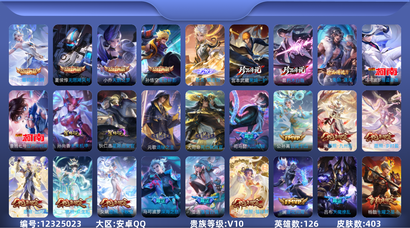 【传说皮肤】 达摩黄金狮子座 后羿黄金射手座 张良黄金白羊座 花木兰冠军飞将 干将莫邪久胜战神 铠绛天战甲 曜云鹰飞将 镜炽阳神光 虞姬云霓雀翎 李信一念神魔 赵云淬星耀世 孙尚香末日机甲 孙悟空地狱火 孙悟空零号赤焰 宫本武藏地狱之眼 王昭君乞巧织情 狄仁杰超时空战士 孙策末日机甲 马超无双飞将 伽罗炽翼辉光 澜逐花归海 亚连落雪白狼 诸葛亮时雨天司 杨戬永曜之星 露娜启示之音 不知火舞绯月行 甄姬至美化雀舞 虞姬启明星使
