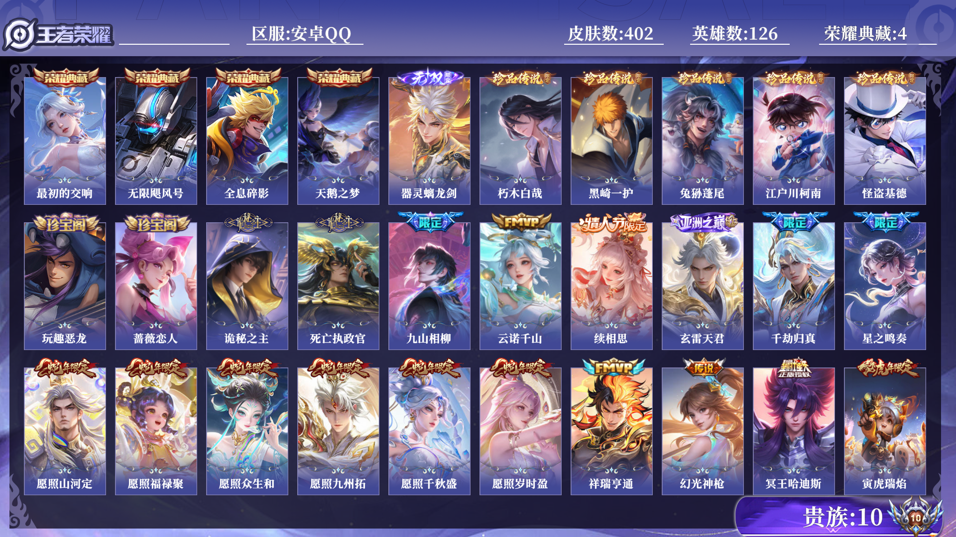 珍品传说皮肤:黑崎一护,朽木白哉,江户川柯南,怪盗基德,兔狲·蓬尾,