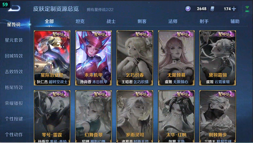史诗限定:白晶晶,御风骁将,曹操夜都魔契,冰锋战神,青春决赛季,百木心枪,至尊宝,孙行者,纯白花嫁,降魔,时之奇旅-妲己,寅虎·心曲,山海·玄木吟,辉光之辰,霸王别姬-虞姬,蜜橘之夏,云端筑梦师,逐梦之翼,一生所爱,逐梦之影,逐梦之音,逐梦之星,天狼溯光者,天狼运算者,逐梦之光,