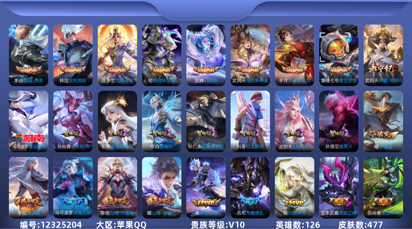 【荣耀典藏】 武则天英雄 鲁班七号星空梦想 武则天倪克斯神谕 芈月大秦宣太后 李白鸣剑曳影 花木兰九霄神辉 铠银白咏叹调 貂蝉幻阙歌 韩信弑枪猎影