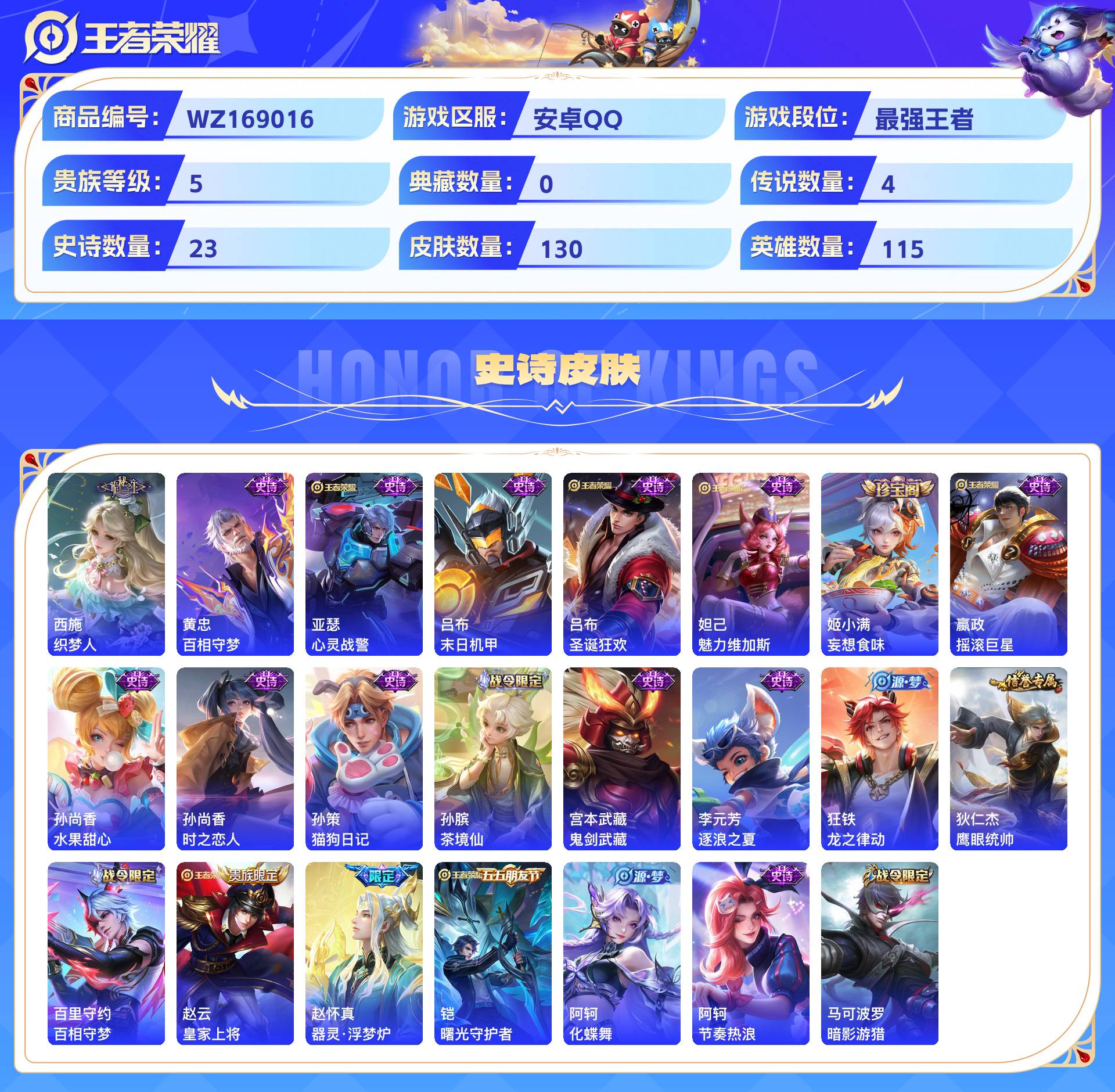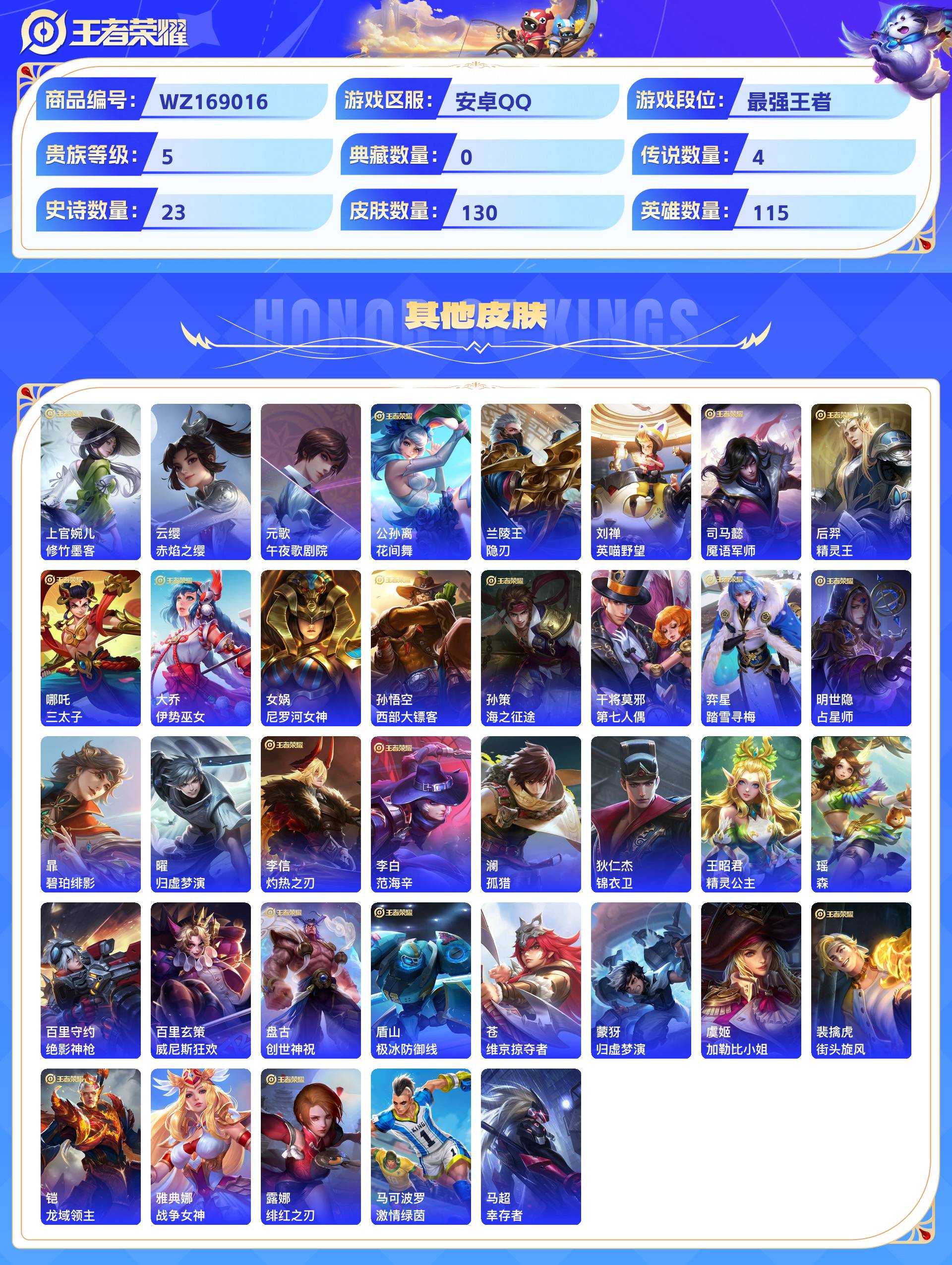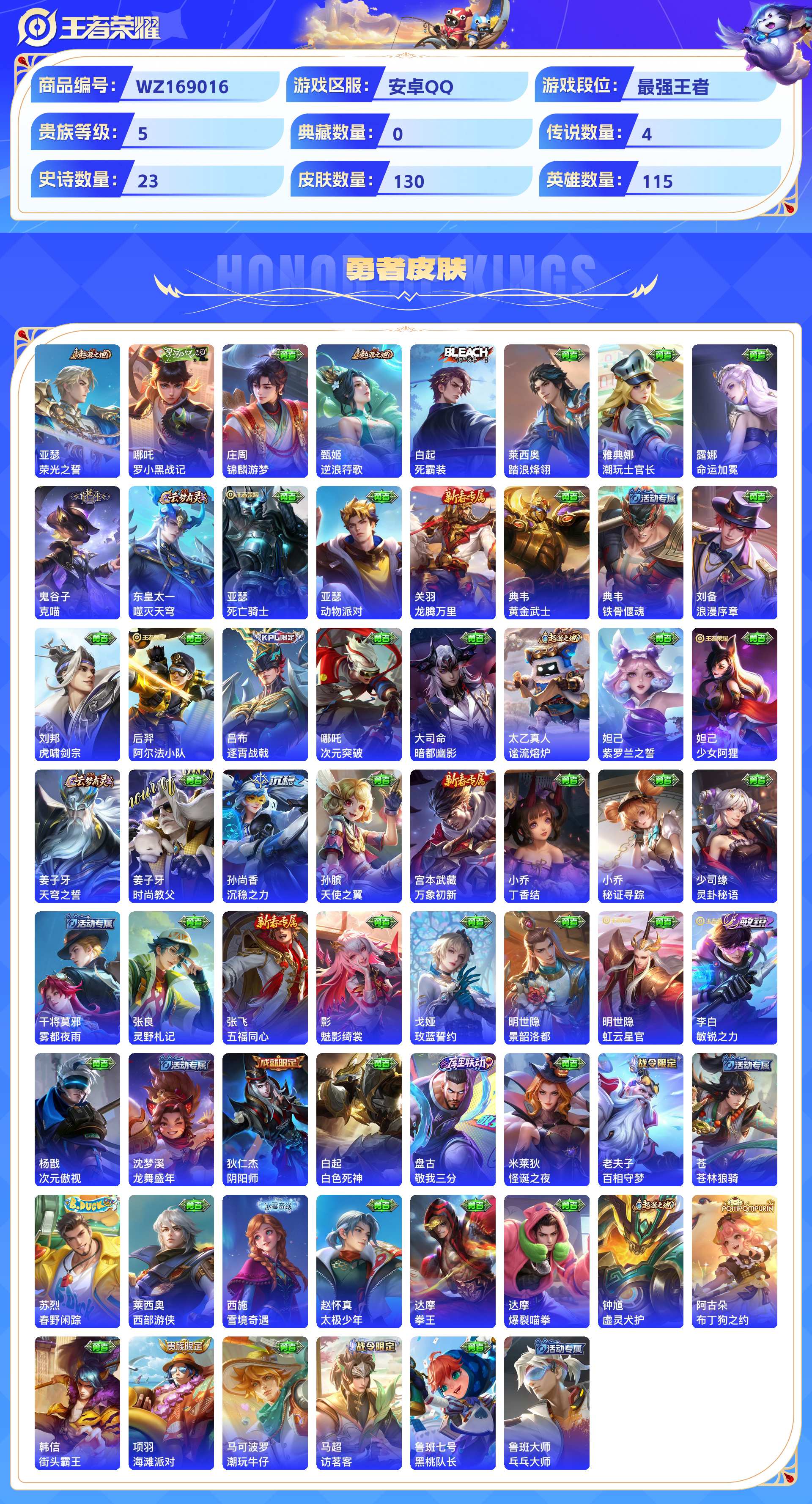 PX_2236083-安卓QQ 130皮 贵族5级 4传说 23史诗【传说皮肤】幻光神枪,鸣野蒿,愿照·九州拓,乞巧织情【史诗皮肤】织梦人,百相守梦,心灵战警,末日机甲,圣诞狂欢,魅力维加斯,妄想食味,摇滚巨星,水果甜心,时之恋人,猫狗日记,茶境仙,鬼剑武藏,逐浪之夏,龙之律动,鹰眼统帅,百相守梦,皇家上将,器灵·浮梦炉,曙光守护者,化蝶舞,节奏热浪,暗影游猎【勇者皮肤】荣光之誓,罗小黑战记,锦麟游梦,逆浪荇歌,死霸装,踏浪烽翎,潮玩士官长,命运加冕,克喵,噬灭天穹,死亡骑士,动物派对,龙腾万里,黄金武士,铁骨偃魂,浪漫序章,虎啸剑宗,阿尔法小队,逐霄战戟,次元突破,暗都幽影,谧流熔炉,紫罗兰之誓,少女阿狸,天穹之誓,时尚教父,沉稳之力,天使之翼,万象初新,丁香结,秘证寻踪,灵卦秘语,雾都夜雨,灵野札记,五福同心,魅影绮裳,玫蓝誓约,景韶洛都,虹云星官,敏锐之力,次元傲视,龙舞盛年,阴阳师,白色死神,敬我三分,怪诞之夜,百相守梦,苍林狼骑,春野闲踪,西部游侠,雪境奇遇,太极少年,拳王,爆裂喵拳,虚灵犬护,布丁狗之约,街头霸王,海滩派对,潮玩牛仔,访茗客,黑桃队长,乓乓大师【其他皮肤】修竹墨客,赤焰之缨,午夜歌剧院,花间舞,隐刃,英喵野望,魇语军师,精灵王,三太子,伊势巫女,尼罗河女神,西部大镖客,海之征途,第七人偶,踏雪寻梅,占星师,碧珀绯影,归虚梦演,灼热之刃,范海辛,孤猎,锦衣卫,精灵公主,森,绝影神枪,威尼斯狂欢,创世神祝,极冰防御线,维京掠夺者,归虚梦演,加勒比小姐,街头旋风,龙域领主,战争女神,绯红之刃,激情绿茵,幸存者【按系统: 安卓QQ】