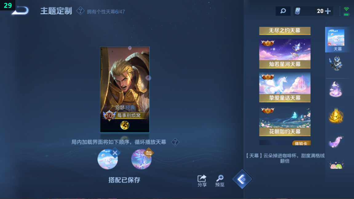 传说限定:天魔缭乱,遇见神鼓,无限倾心-项羽,落雪白狼,山海·炽霜斩,挚爱之约,乘龙·淬吴钩,浮生妄,乘龙·铭钟鼎,默契交锋-兰陵王,影龙天霄,前尘镜,齐天大圣,云中君群星魔术团,电玩·雷克斯,山海·琳琅生,遇见胡旋,貂蝉曦玄引,星穹之声,永恒水手月亮,绯月行,画中仙,武陵仙君,鹤羽星尊,金乌负日,异界灵契,乘龙·问璇玑,深海之息,妄想实况,夜礼服假面,艾琳觅芳踪,无尽星芒,无限倾心-虞姬,祈雪灵祝,太华,炽翼辉光,百相守梦(张飞),挚爱花嫁,大乔-时之奇旅,时之祈愿-瑶,燃星之曲,启示之音,山海·苍雷引,妄想奇谈,启明星使,