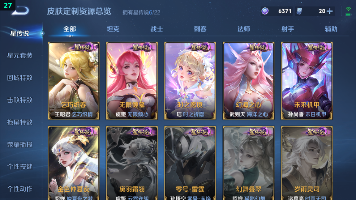 小乔全皮,武则天全皮,虞姬全皮,瑶全皮,李信全皮,海月全皮,刘备全皮,大乔全皮,