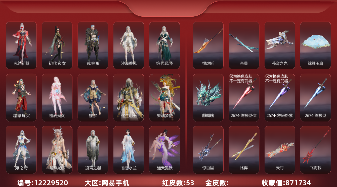 [12229520]BBE098网易手机53个红皮,泳装9个【高校水着(胡桃),椰风夕照(季沧海),热海白珊(妖刀姬),午后瑰夏(宁红夜),昭夏流金(迦南),仲夏霜华(顾清寒),弄潮逐浪(崔三娘),盛夏白阳(季莹莹),赤夏悠漾(玉玲珑),精武魂(季沧海),】,可以直接换绑网易支付未实名,道具货币都是默认已使用.奥义特效14个【神君印(岳山),赤徽(岳山),炎烈珠(季沧海),初代机(沈妙),绿野守护·竹韵悠(沈妙),神乌造像(天海),石龛造像(天海),珥冰(天海),百战·枷锁(魏轻),楚韵九歌·四海(哈迪),噬骨(哈迪),镇冥司(刘炼),雪霜姿(顾清寒),宝葫芦(玉玲珑),】小技能特效6个【剪纸·彩刀(妖刀姬),三娃葫芦(天海),千秋匠心·凶虎(胡为),观山海·春木(殷紫萍),霜翎(哈迪),拳皇·勾玉(胡为),】胡为吕布全套,岳山杨戬+变身器+三尖两刃刀全套,岳山2674衣服+变身器高达套装,武器红皮26个【2674·终极型,悍虎斩,帝星,惊百里,麒麟魄,烈阳,西行劫·如意金箍棒,冰魄,2674·九阴,飞将戟,锦鲤玉扇,比羿,灵狐幻刃,天琼,涯角,逆晦朔,凤求凰,狂龙,少阳剑,灵犀,狼主,苍穹之光,天罚,毕方,2674·终极型·紫,2674·终极型·红,】其他红皮27个【流金晓锦,画中仙,星辉魔纱,樱云天女,守墨麟,逐光者,夜魅游莹,监兵凶神,执明神君,化道者,通天狐袄,暮光胴丸,赤皓新囍,化生明王,泣珠龙纱,长天藏锦,蛉魂梦使,海之奇,香雪水兰,朱雀星衣,沙漠香风,蝶梦,凌霄之羽,初代玄女,戎金狼,绝代风华,熛怒炼火,】飞鼠,劫涛·潮,春桃笑,昊天,小舞,海神三叉戟,杨戬,自动人形·2B,自动人形·A2,悟空,2674·街头烈火,玄豹姿,春日序曲·赤羽,唐三,霍雨浩,庖丁·食神,龙心炽焰,信手斩龙,霜天红叶,龙之影·龙虎斗,花无痕,枫行者,西行劫·悟净,千秋匠心·青枝瓷,逆水寒·江海羲炎,孽炎祸斗,百战·破荆者,观山海·夏神祝融,护世四法·增长天王,巨阙,丹青墨意,紫金玉女,西行劫·蜘蛛精,夜华朝,护世四法·多闻天王,金羽圣鹰,龙之道·求真,浣烟纱,惊云羽,龙门·飞天,神鹰之女,观山海·青鸟,千秋匠心·玉叶景,天钿女命,春桃笑,承云兰寿,日道神子,【按系统: 网易国服】
