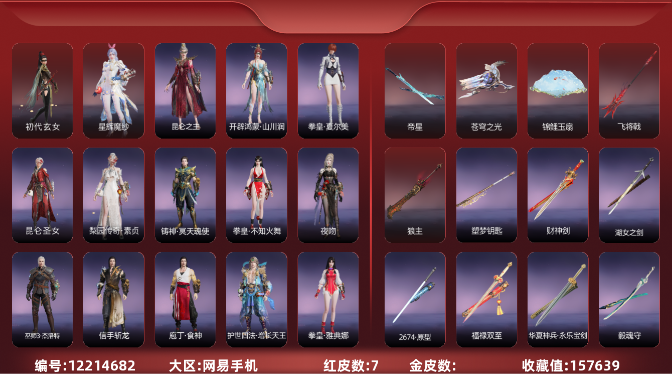 [12214682]0AGPEN网易手机7个红皮,泳装1个【赤夏悠漾(玉玲珑),】奥义特效7个【神君印(岳山),赤徽(岳山),珥冰(天海),镇冥司(刘炼),雪霜姿(顾清寒),夜蔷薇(季莹莹),御祥云(特木尔),】下次换绑时间2025/10/29,等待换绑期间可以登入网易大神直接进入游戏不影响游戏体验。网易支付未实名,道具货币都是默认已使用.小技能特效2个【千秋匠心·凶虎(胡为),拳皇·勾玉(胡为),】武器红皮5个【帝星,飞将戟,锦鲤玉扇,狼主,苍穹之光,】其他红皮2个【星辉魔纱,初代玄女,】庖丁·食神,信手斩龙,梨园传奇·素贞,春日序曲·晨风,新魔杰·斩魔天将,百战·破荆者,护世四法·增长天王,夜吻,新魔杰·伏龙尊者,龙之影·过江龙,逆水寒·极夜天曦,千秋匠心·杜虎符,铸神·冥天魂使,铸神·天渊御水,观山海·精卫,铸神·风卫天翎,铸神·天禄瑞光,古冢行,青灯,绿野守护·暗沼摩罗,羽影,绿野守护·山漠狞影,绿野守护·悠竹萌客,拳皇·夏尔美,拳皇·不知火舞,巫师3·杰洛特,拳皇·雅典娜,九骊之君,决战平安京·恋念私语,【按系统: 网易国服】