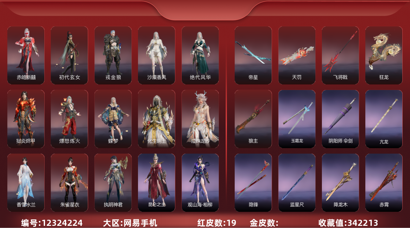 [12324224]0ACYLP网易手机19个红皮,泳装2个【半夏晚风(魏轻),盛夏白阳(季莹莹),】奥义特效5个【神君印(岳山),炎烈珠(季沧海),初代机(沈妙),珥冰(天海),彩佣娃娃(妖刀姬),】小技能特效1个【剪纸·彩刀(妖刀姬),】武器红皮5个【帝星,飞将戟,狂龙,狼主,天罚,】网易年超限,等待换绑期间可以登入网易大神直接进入游戏不影响游戏体验。网易支付未实名,道具货币都是默认已使用.其他红皮14个【狱炎烬甲,执明神君,赤皓新囍,化生明王,泣珠龙纱,墨离,香雪水兰,朱雀星衣,沙漠香风,蝶梦,初代玄女,戎金狼,绝代风华,熛怒炼火,】劫涛·潮,玄豹姿,唐三,龙心炽焰,新魔杰·斩魔天将,巨阙,紫金玉女,夜华朝,护世四法·多闻天王,惊云羽,火罗圣女,神鹰之女,千秋匠心·玉叶景,长歌诗韵·遣唐使,守誓者,掌珠仙子,金羽客,司天命,逆水寒·极夜天曦,寒英素雪,寒烟素,新倩女幽魂·流纨裙,观山海·冬神玄冥,护世四法·持国天王,干将莫邪,观山海·秋神蓐收,黄昏巫主,日影花阴,护世四法·广目天王,夜绸袍,绮云衫,劫涛·潮,葫芦兄弟·蛤蟆头领,封神录·申公豹,封神录·姜子牙,观山海·相柳,观山海·精卫,铸神·天禄瑞光,梨园传奇·丽娘,封神录·哪吒,羽影【按系统: 网易国服】