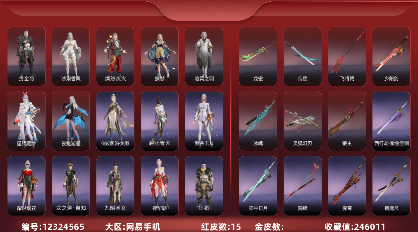 [12324565]0AGFDH网易手机14个红皮,奥义特效1个【珥冰(天海),】下次换绑时间2025/10/27,等待换绑期间可以登入网易大神直接进入游戏不影响游戏体验。网易支付未实名,道具货币都是默认已使用.武器红皮6个【帝星,冰魄,飞将戟,灵狐幻刃,少阳剑,狼主,】其他红皮8个【龙雀,星辉魔纱,夜魅游莹,沙漠香风,蝶梦,凌霄之羽,戎金狼,熛怒炼火,】飞鼠,春桃笑,海神三叉戟,唐三,孽炎祸斗,观山海·夏神祝融,龙之道·自知,紫金玉女,夜华朝,火罗圣女,天钿女命,春桃笑,梨园传奇·法海,武道无穷·少林,龙之影·过江龙,守誓者,掌珠仙子,金羽客,司天命,金襦玉衫,寒烟素,花之倾奇,观山海·冬神玄冥,观山海·秋神蓐收,黄昏巫主,夜绸袍,街头狂欢·涂鸦少女,葫芦兄弟·蛤蟆头领,【按系统: 网易国服】