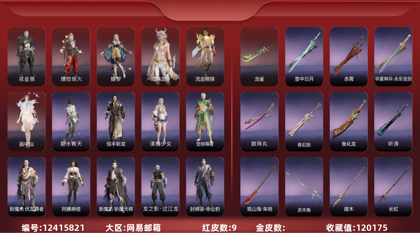 [12415821]0AGWR5网易邮箱8个红皮,奥义特效2个【荆魂(岳山),珥冰(天海),】小技能特效1个【千秋匠心·凶虎(胡为),】下次换绑时间2025/11/1,等待换绑期间可以登入网易大神直接进入游戏不影响游戏体验。网易支付未实名,道具货币都是默认已使用.其他红皮8个【流金晓锦,画中仙,龙雀,泣珠龙纱,墨离,蝶梦,戎金狼,熛怒炼火,】信手斩龙,新魔杰·斩魔天将,新魔杰·伏龙尊者,龙之影·过江龙,英雄袍,观山海·朱明,封神录·申公豹,阿娜希塔,【按系统: 网易国服】