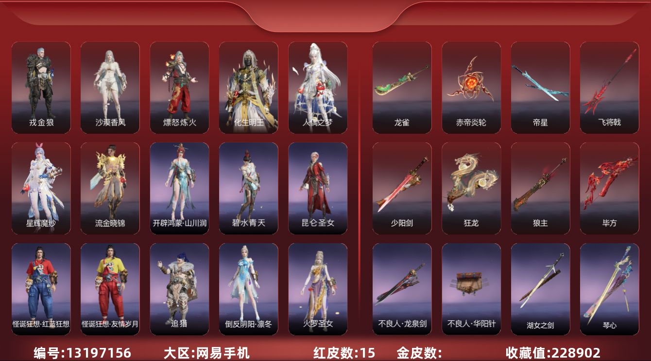 [13197156]0AHZEI网易手机15个红皮,泳装1个【高校水着(胡桃),】奥义特效2个【荆魂(岳山),销兵镝遗(岳山),】小技能特效1个【拳皇·勾玉(胡为),】网易年超限,等待换绑期间可以登入网易大神直接进入游戏不影响游戏体验。网易支付未实名,道具货币都是默认已使用.武器红皮7个【赤帝炎轮,帝星,飞将戟,狂龙,少阳剑,狼主,毕方,】其他红皮8个【流金晓锦,龙雀,人偶之梦,星辉魔纱,化生明王,沙漠香风,戎金狼,熛怒炼火,】劫涛·潮,观山海·腓腓,杨戬,信手斩龙,百战·破荆者,浣烟纱,火罗圣女,阴阳师·灼舞桃节,龙之影·过江龙,花之倾奇,劫涛·潮,咕咕(连弩),梨园传奇·柳生,观山海·精卫,绿野守护·暗沼摩罗,赤雾烟霞,绿野守护·山漠狞影,绿野守护·悠竹萌客,巫师3·杰洛特,九骊之君,【按系统: 网易国服】