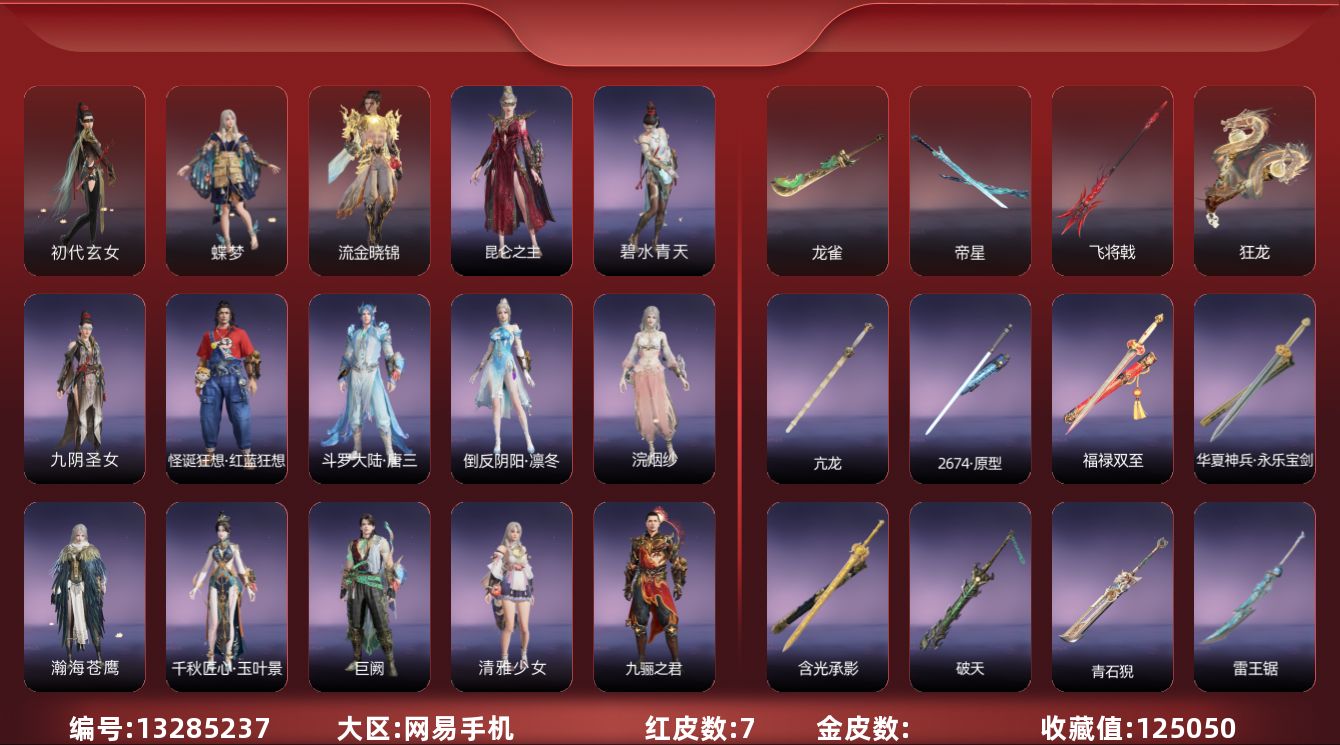 [13285237]0AJ06O网易手机7个红皮,泳装1个【盛夏白阳(季莹莹),】奥义特效1个【荆魂(岳山),】武器红皮3个【帝星,飞将戟,狂龙,】其他红皮4个【流金晓锦,龙雀,蝶梦,初代玄女,】下次换绑时间2025/11/20,等待换绑期间可以登入网易大神直接进入游戏不影响游戏体验。网易支付未实名,道具货币都是默认已使用.唐舞桐,唐三,百战·破荆者,巨阙,浣烟纱,千秋匠心·玉叶景,干将莫邪,护世四法·广目天王,楚韵九歌·云中君,葫芦兄弟·蛤蟆头领,封神录·申公豹,阿娜希塔,封神录·龙吉公主,封神录·姜子牙,九骊之君,【按系统: 网易国服】