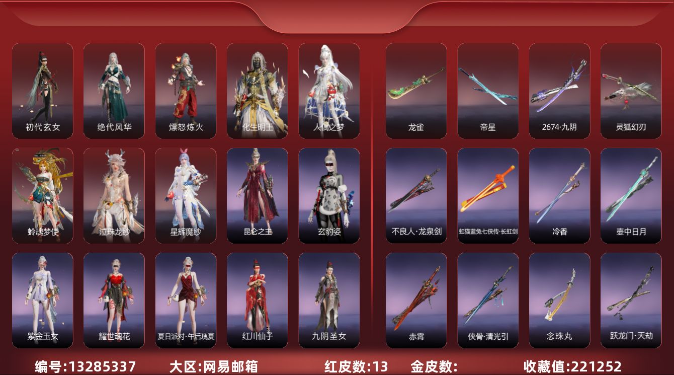 [13285337]0AJ0CU网易邮箱13个红皮,泳装6个【高校水着(胡桃),椰风夕照(季沧海),热海白珊(妖刀姬),午后瑰夏(宁红夜),仲夏霜华(顾清寒),弄潮逐浪(崔三娘),精武魂(季沧海),】下次换绑时间2025/11/20,等待换绑期间可以登入网易大神直接进入游戏不影响游戏体验。网易支付未实名,道具货币都是默认已使用.奥义特效3个【炎烈珠(季沧海),初代机(沈妙),石龛造像(天海),】小技能特效1个【观山海·春木(殷紫萍),】武器红皮3个【帝星,2674·九阴,灵狐幻刃,】其他红皮10个【龙雀,人偶之梦,星辉魔纱,化生明王,泣珠龙纱,墨离,蛉魂梦使,初代玄女,绝代风华,熛怒炼火,】飞鼠,春桃笑,悟空,玄豹姿,龙心炽焰,紫金玉女,浣烟纱,火罗圣女,神鹰之女,春桃笑,龙之影·过江龙,常胜袍,花之倾奇,新倩女幽魂·流纨裙,沐昭,斑斓衣,2674·千机喵,楚韵九歌·山鬼,咯咯,梨园传奇·丽娘,赤雾烟霞,【按系统: 网易国服】