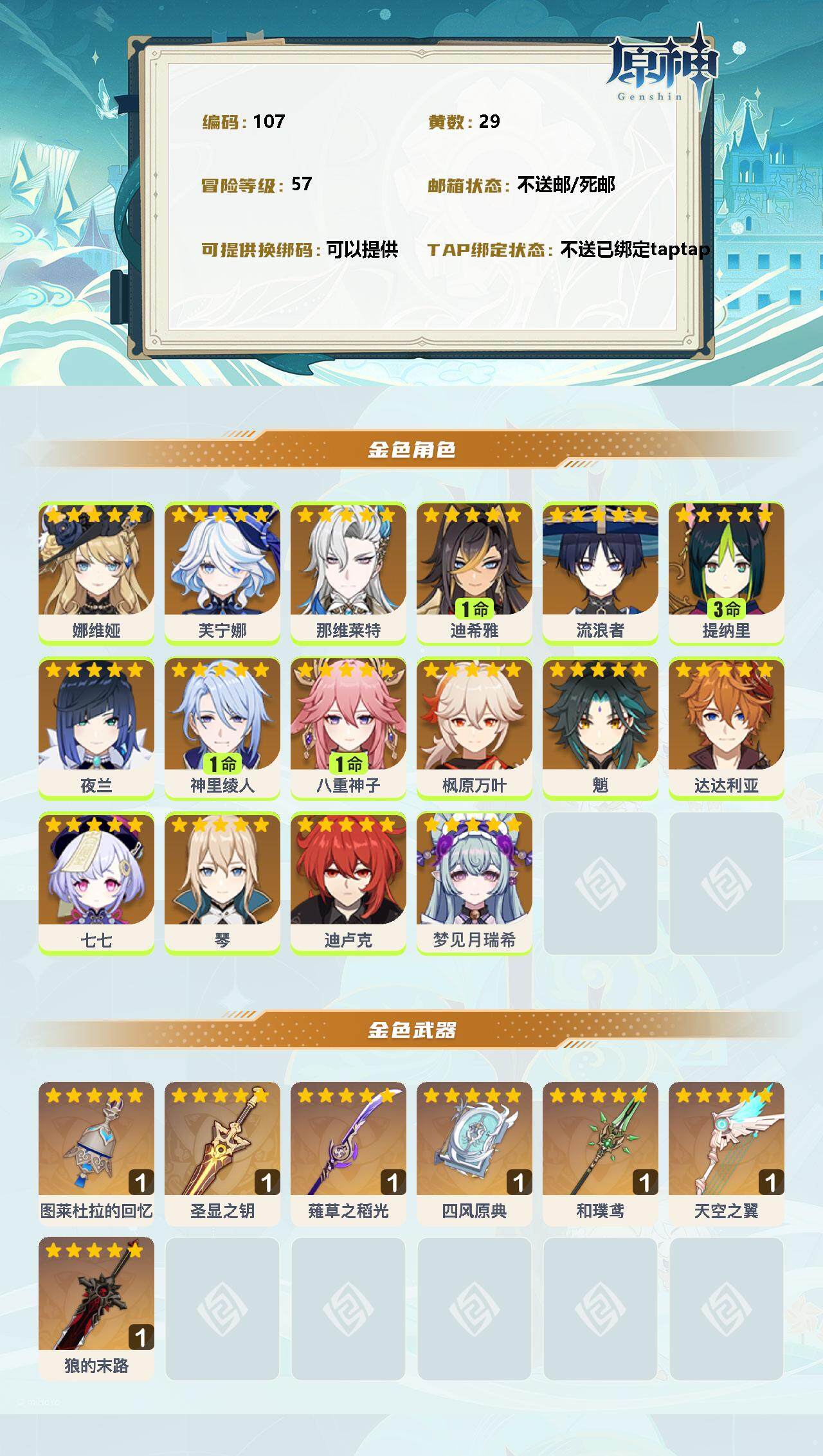 0命娜维娅,0命芙宁娜,0命那维莱特,1命迪希雅,0命流浪者,3命提纳里,0命夜兰,1命神里绫人,1命八重神子,0命枫原万叶,0命魈,0命达达利亚,0命七七,0命琴,0命迪卢克,0命梦见月瑞希,精1图莱杜拉的回忆,精1圣显之钥,精1薙草之稻光,精1四风原典,精1和璞鸢,精1天空之翼,精1狼的末路【按邮箱: 邮箱不出售】