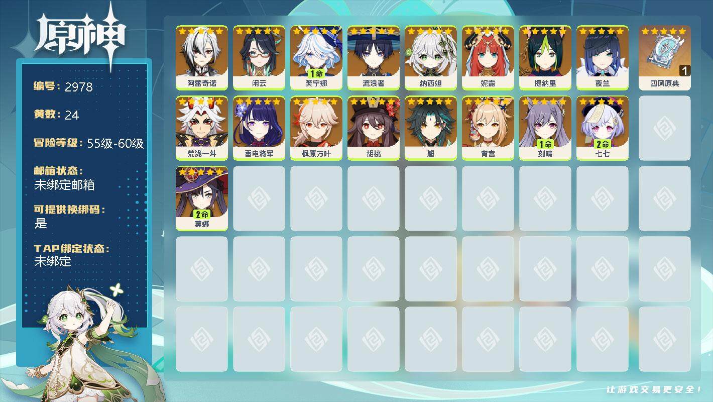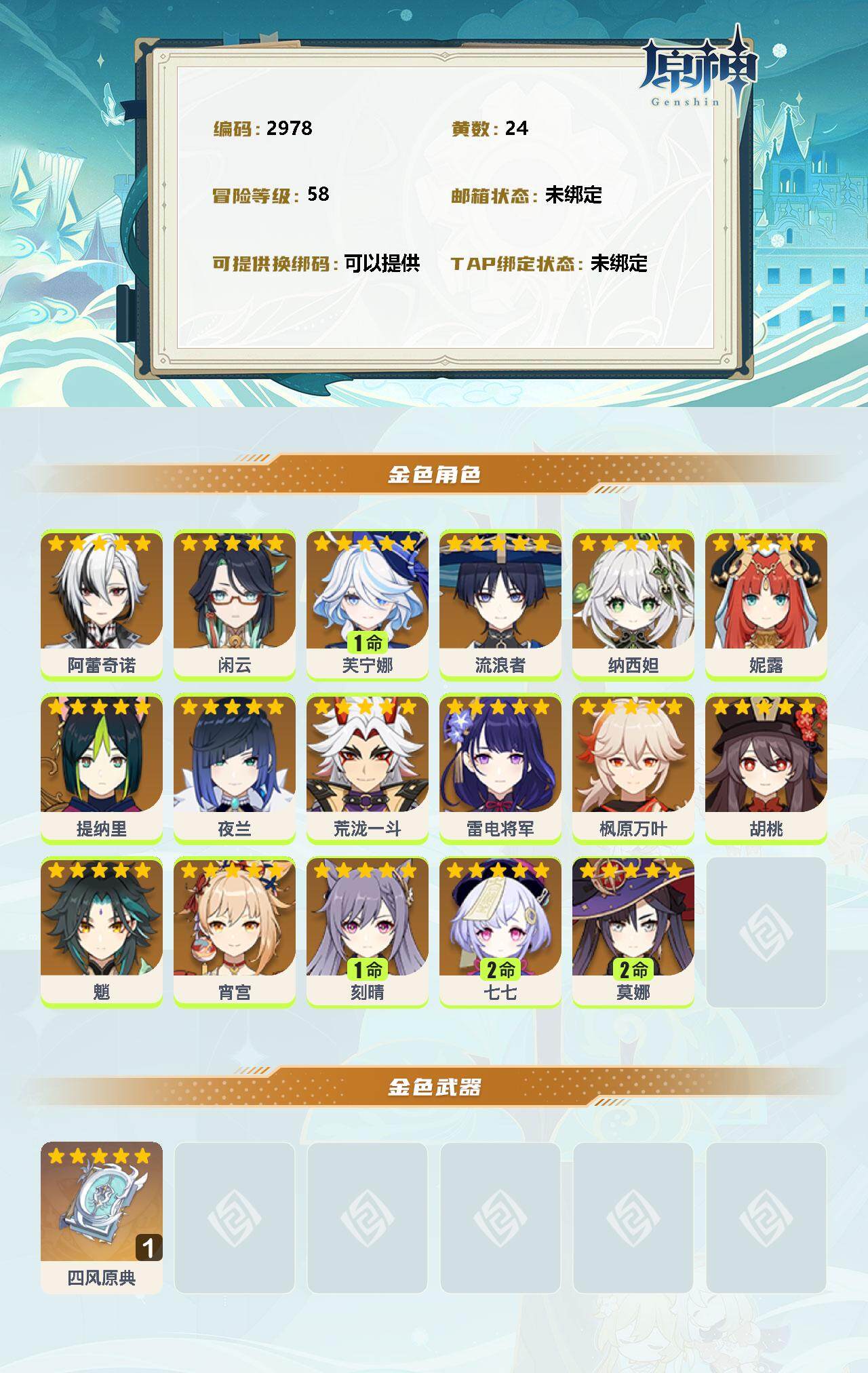 0命阿蕾奇诺,0命闲云,1命芙宁娜,0命流浪者,0命纳西妲,0命妮露,0命提纳里,0命夜兰,0命荒泷一斗,0命雷电将军,0命枫原万叶,0命胡桃,0命魈,0命宵宫,1命刻晴,2命七七,2命莫娜,精1四风原典【按邮箱: 邮箱未绑定】