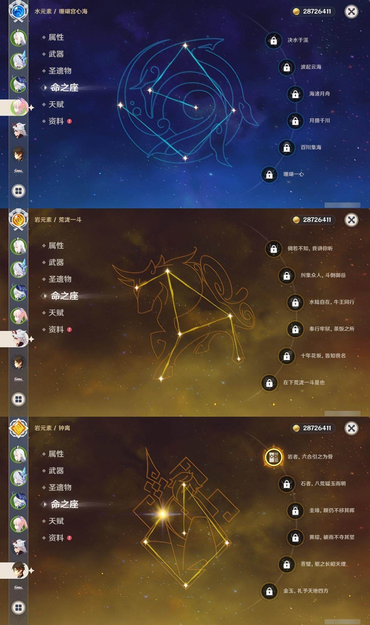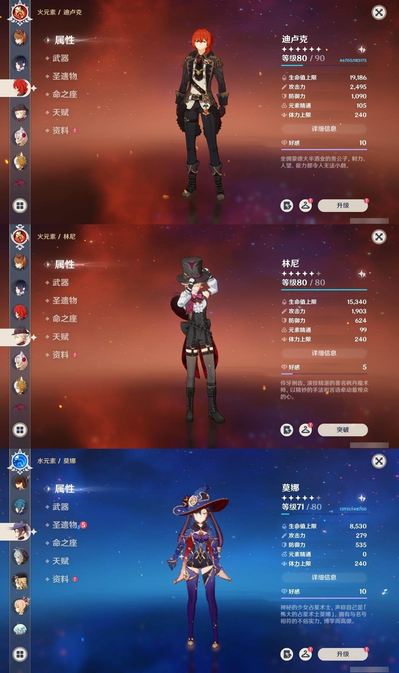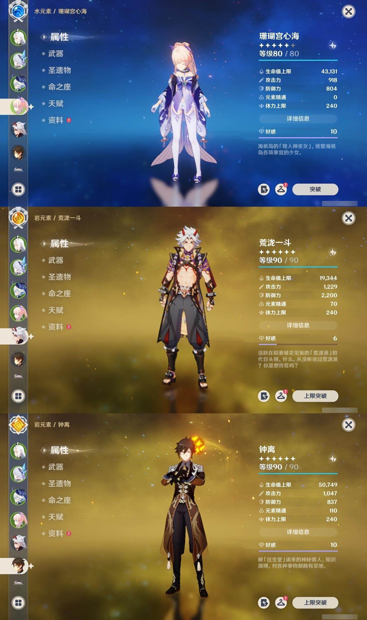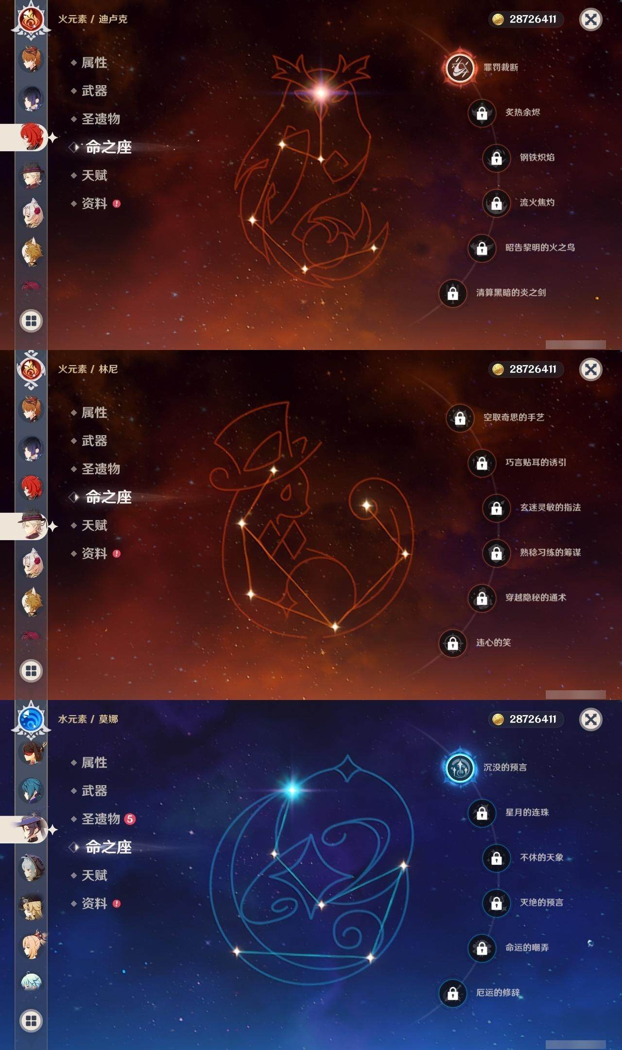 【一命角色】 1命钟离 1命雷电将军 1命纳西妲 1命胡桃 1命可莉 1命迪卢克 1命莫娜