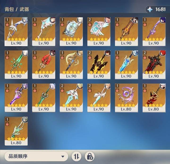 【武器】 阿莫斯之弓 天空之翼 四风原典 天空之卷 赤沙之杖 薙草之稻光 和璞鸢 护摩之杖 无工之剑 松籁响起之时 狼的末路 雾切之回光 磐岩结绿 天空之刃 风鹰剑 不灭月华 赤角石溃杵 裁叶萃光