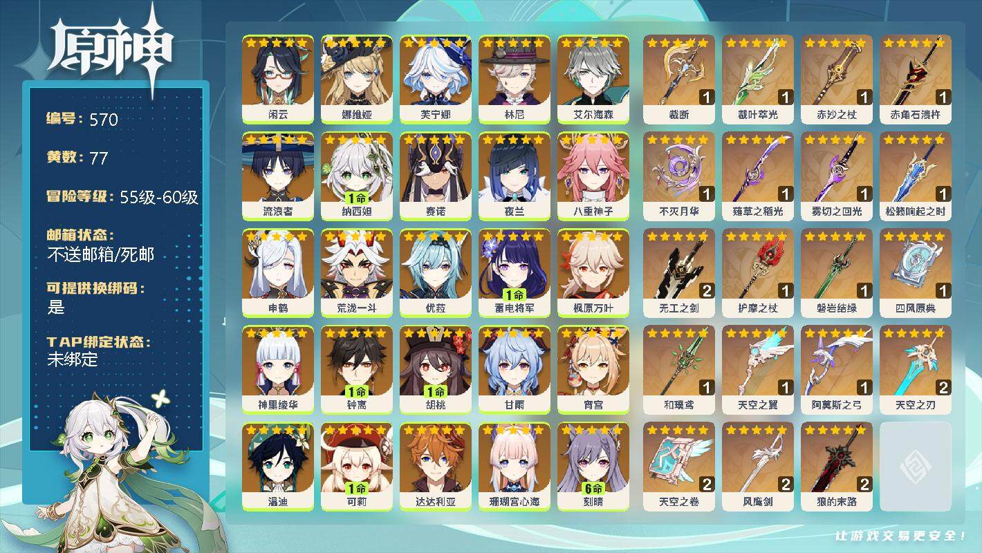 0命闲云,0命娜维娅,0命芙宁娜,0命林尼,0命艾尔海森,0命流浪者,1命纳西妲,0命赛诺,0命夜兰,0命八重神子,0命申鹤,0命荒泷一斗,0命优菈,1命雷电将军,0命枫原万叶,0命神里绫华,1命钟离,1命胡桃,0命甘雨,0命宵宫,0命温迪,1命可莉,0命达达利亚,0命珊瑚宫心海,满命刻晴,5命七七,3命琴,1命莫娜,1命迪卢克,0命希诺宁,0命梦见月瑞希,0命丝柯克,精1裁断,精1裁叶萃光,精1赤沙之杖,精1赤角石溃杵,精1不灭月华,精1薙草之稻光,精1雾切之回光,精1松籁响起之时,精2无工之剑,精1护摩之杖,精1磐岩结绿,精1四风原典,精1和璞鸢,精1天空之翼,精1阿莫斯之弓,精2天空之刃,精2天空之卷,精2风鹰剑,精2狼的末路【按邮箱: 邮箱不出售】
