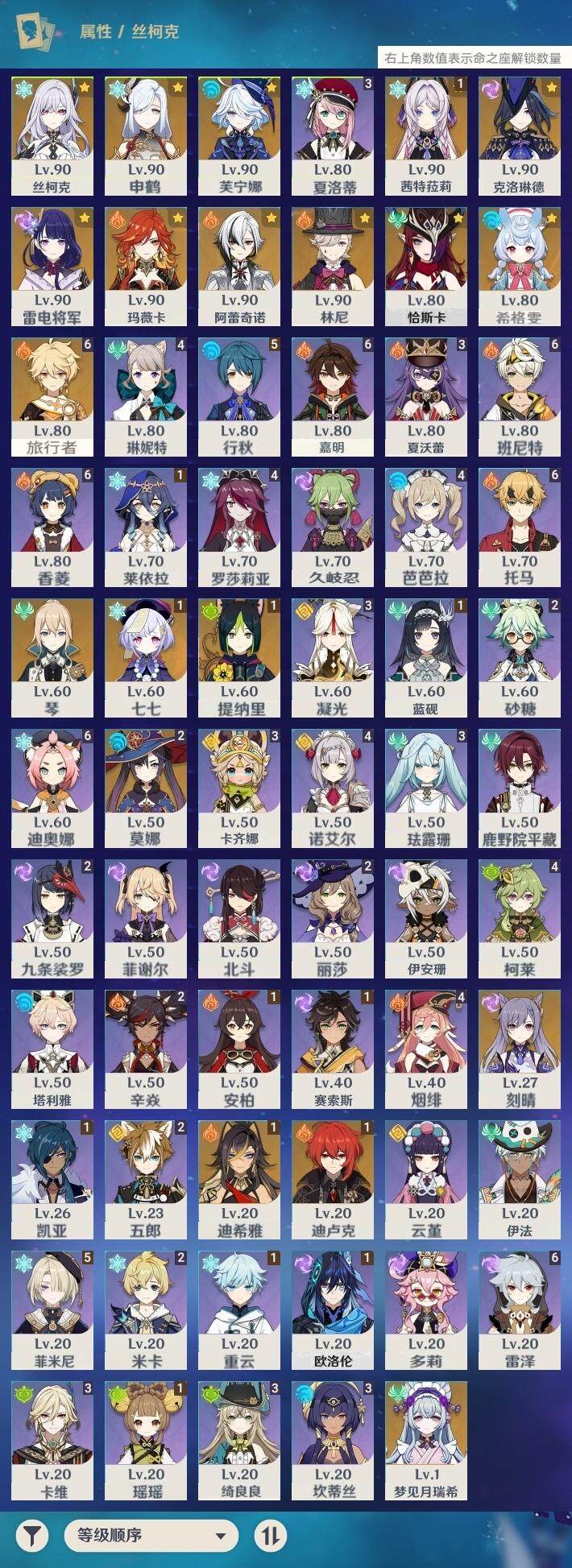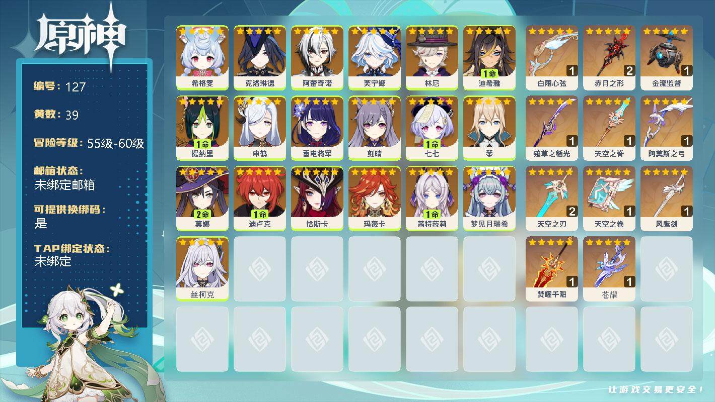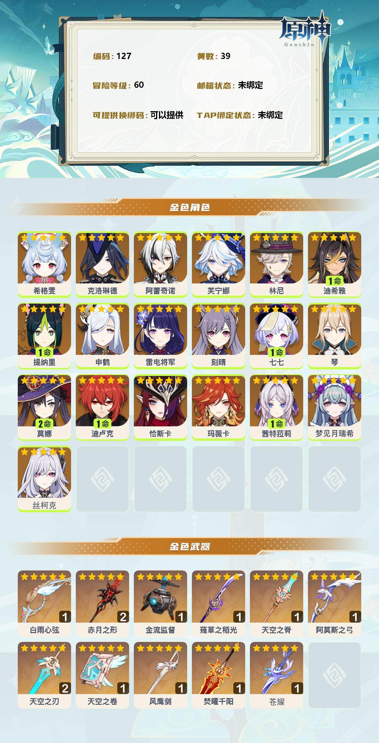 0命希格雯,0命克洛琳德,0命阿蕾奇诺,0命芙宁娜,0命林尼,1命迪希雅,1命提纳里,0命申鹤,0命雷电将军,0命刻晴,1命七七,0命琴,2命莫娜,1命迪卢克,0命恰斯卡,0命玛薇卡,1命茜特菈莉,0命梦见月瑞希,0命丝柯克,精1白雨心弦,精2赤月之形,精1金流监督,精1薙草之稻光,精1天空之脊,精1阿莫斯之弓,精2天空之刃,精1天空之卷,精1风鹰剑,精1焚曜千阳,精1苍耀【按邮箱: 邮箱未绑定】