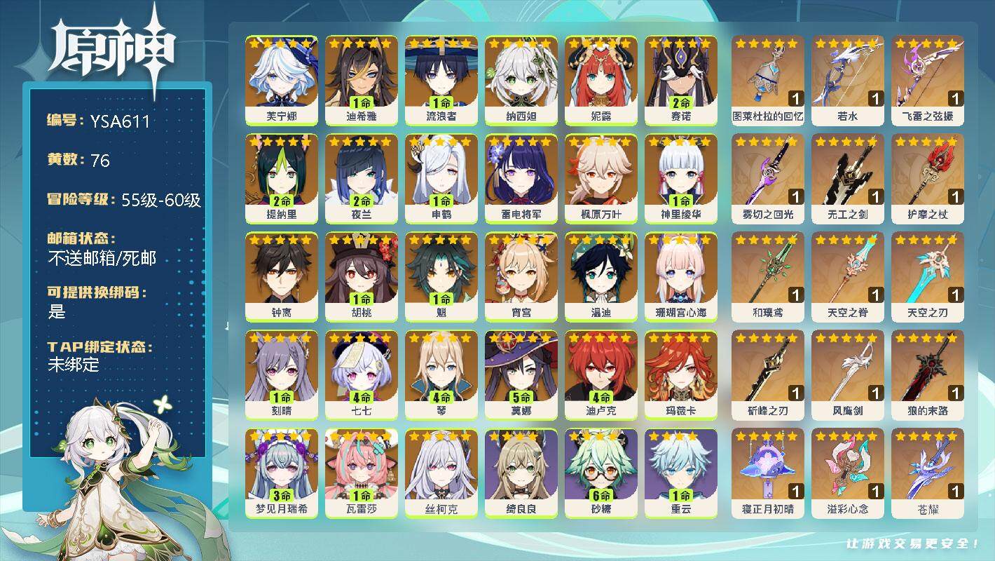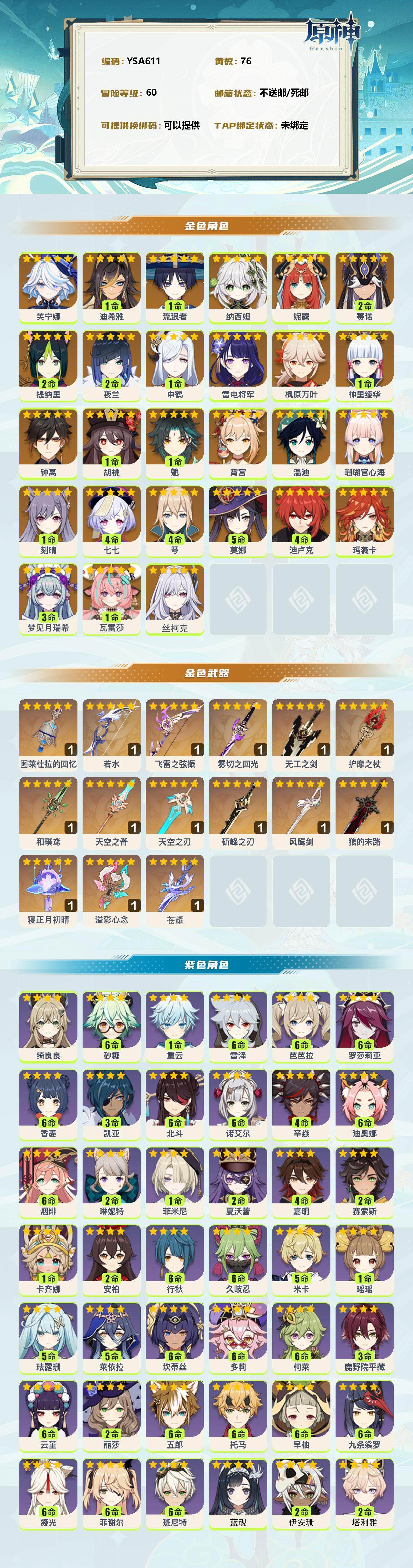 【YSA611】60级/76黄/女主/61个五星角色/15个五星武器/0命丝柯克/1命瓦雷莎/3命梦见月瑞希/0命玛薇卡/0命芙宁娜/1命迪希雅/1命流浪者/纳西妲/妮露/2命赛诺/2命提纳里/2命夜兰/1命申鹤/珊瑚宫心海/雷电将军/宵宫/1命神里绫华/枫原万叶/1命胡桃/1命魈/钟离/温迪/4命琴/1命刻晴/4命迪卢克/5命莫娜/4命七七/精1苍耀/精1溢彩心念/精1寝正月初晴/图莱杜拉的回忆/若水/雾切之回光/飞雷之弦振/护摩之杖/斫峰之刃/无工之剑/和璞鸢/狼的末路/风鹰剑/天空之脊/天空之刃/2命塔利雅/2命伊安珊/0命蓝砚/1命卡齐娜/2命赛索斯/4命嘉明/2命夏沃蕾/1命菲米尼/2命琳妮特/0命绮良良/5命米卡/1命瑶瑶/5命珐露珊/5命莱依拉/满命坎蒂丝/满命多莉/满命柯莱/3命鹿野院平藏/满命久岐忍/满命云堇/满命五郎/满命托马/满命九条裟罗/满命早柚/满命烟绯/满命罗莎莉亚/4命辛焱/满命迪奥娜/满命砂糖/满命雷泽/满命菲谢尔/2命丽莎/满命北斗/满命香菱/2命安柏/满命班尼特/满命行秋/满命芭芭拉/满命凝光/满命诺艾尔/3命凯亚/1命重云【按邮箱: 邮箱不出售】