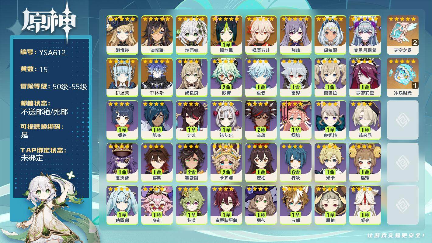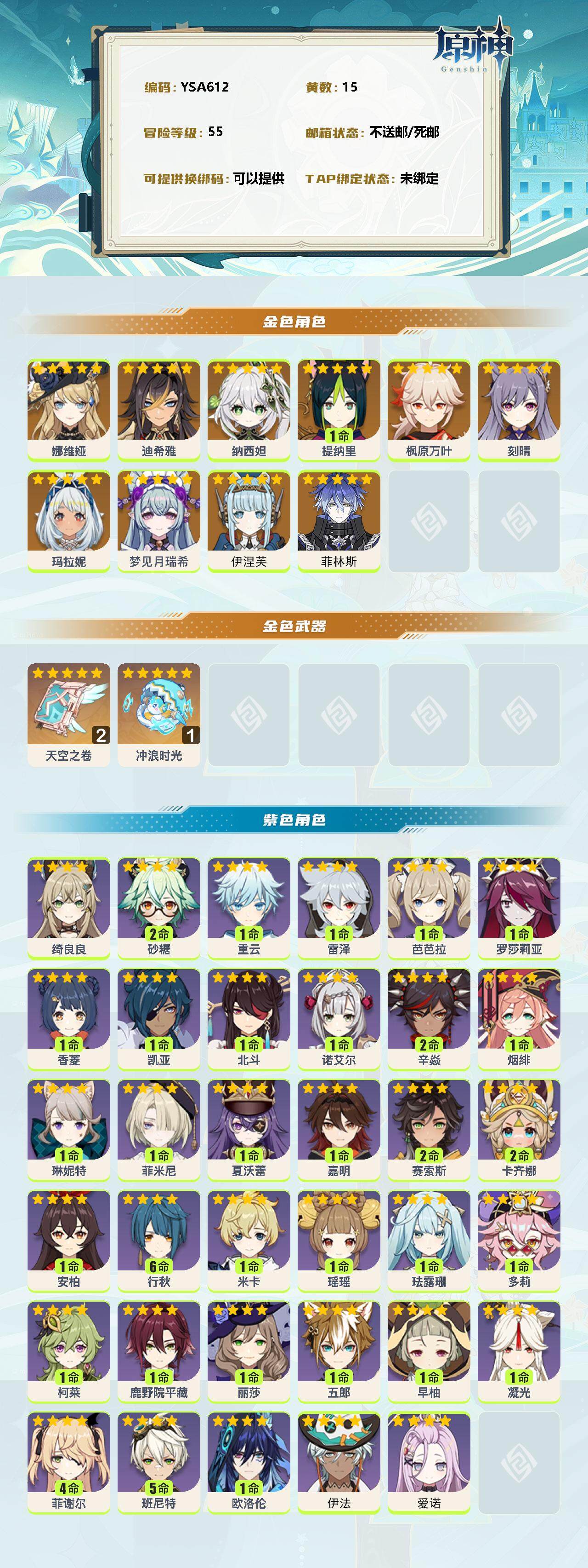 【YSA612】55级/15黄/女主/11个五星角色/4个五星武器/0命菲林斯/0命伊涅芙/0命梦见月瑞希/0命玛拉妮/0命娜维娅/迪希雅/纳西妲/1命提纳里/枫原万叶/刻晴/精1冲浪时光/精2天空之卷/0命爱诺/0命伊法/0命欧洛伦/2命卡齐娜/2命赛索斯/0命嘉明/0命夏沃蕾/0命菲米尼/0命琳妮特/0命绮良良/0命米卡/0命瑶瑶/0命珐露珊/0命多莉/0命柯莱/1命鹿野院平藏/0命五郎/0命早柚/0命烟绯/1命罗莎莉亚/2命辛焱/2命砂糖/0命雷泽/4命菲谢尔/0命丽莎/0命北斗/1命香菱/0命安柏/5命班尼特/满命行秋/1命芭芭拉/0命凝光/0命诺艾尔/0命凯亚/1命重云【按邮箱: 邮箱不出售】