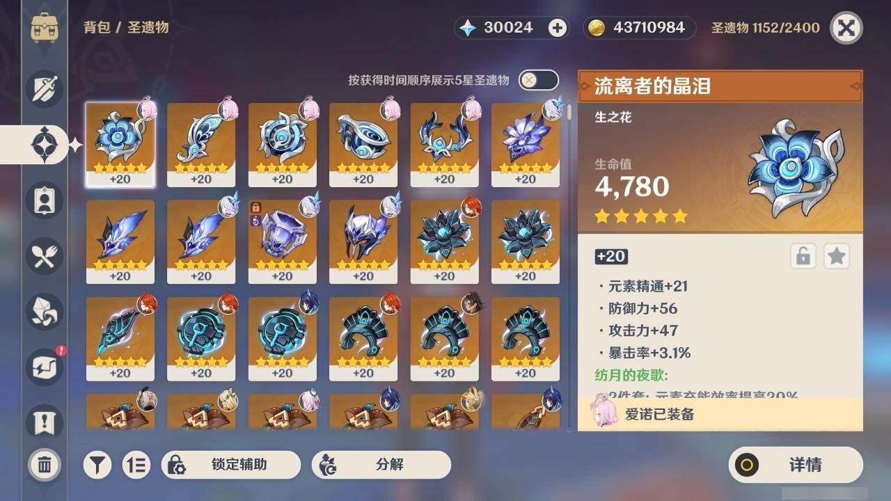 【武器】 飞雷之弦振 若水 终末嗟叹之诗 阿莫斯之弓 千夜浮梦 薙草之稻光 和璞鸢 贯虹之槊 护摩之杖 无工之剑 松籁响起之时 狼的末路 裁叶萃光 波乱月白经津 雾切之回光 苍古自由之誓 天空之刃 天空之卷 息灾