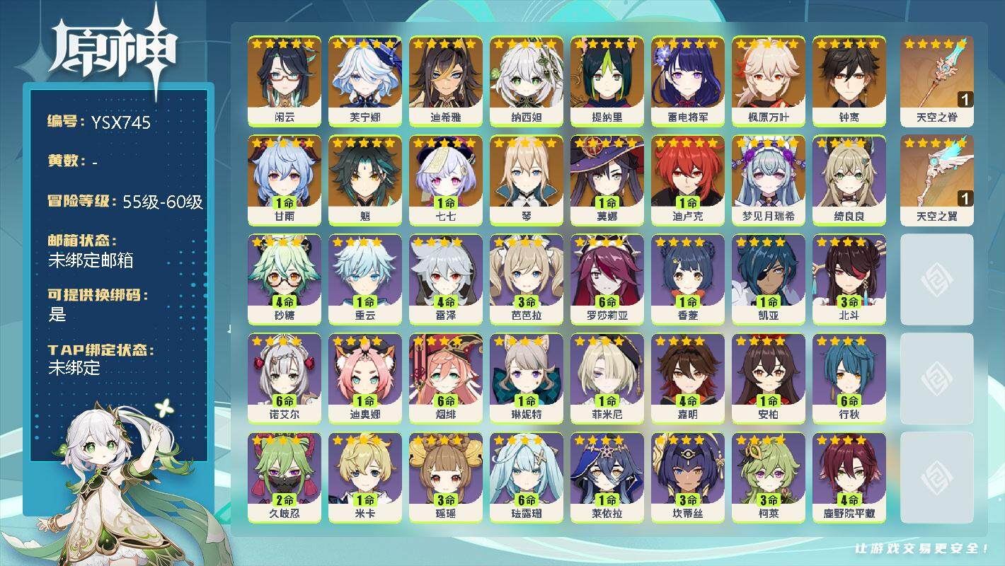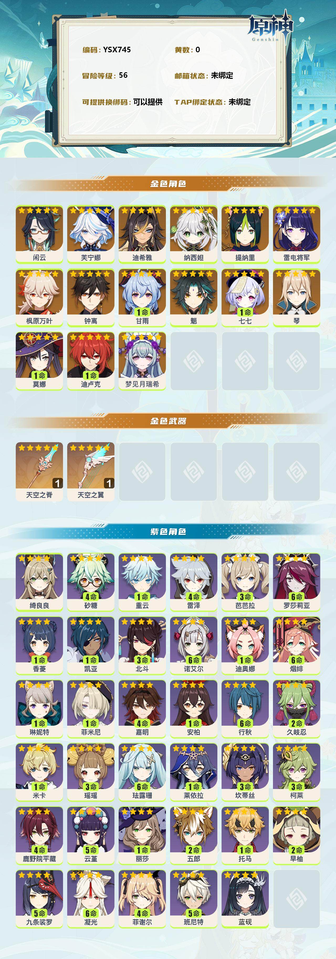 【YSX745】56级/女主/17个五星角色/0命梦见月瑞希/0命闲云/0命芙宁娜/迪希雅/纳西妲/提纳里/雷电将军/枫原万叶/魈/1命甘雨/钟离/琴/1命迪卢克/1命莫娜/1命七七/天空之脊/天空之翼/0命蓝砚/4命嘉明/0命菲米尼/0命琳妮特/0命绮良良/1命米卡/3命瑶瑶/满命珐露珊/1命莱依拉/3命坎蒂丝/3命柯莱/4命鹿野院平藏/2命久岐忍/5命云堇/2命五郎/1命托马/5命九条裟罗/2命早柚/满命烟绯/满命罗莎莉亚/0命迪奥娜/4命砂糖/4命雷泽/4命菲谢尔/1命丽莎/3命北斗/1命香菱/0命安柏/5命班尼特/满命行秋/3命芭芭拉/满命凝光/满命诺艾尔/0命凯亚/1命重云【按邮箱: 邮箱未绑定】