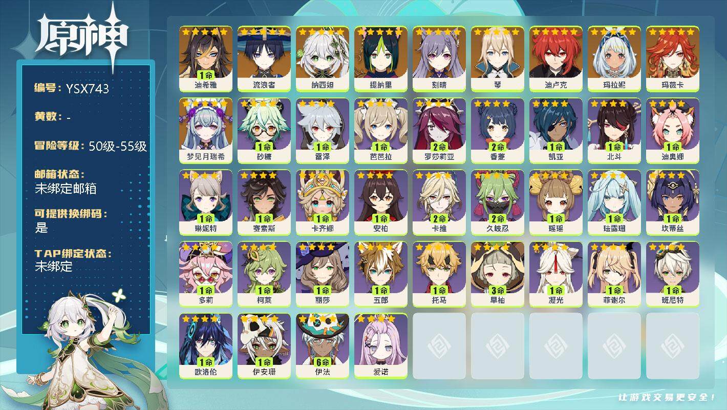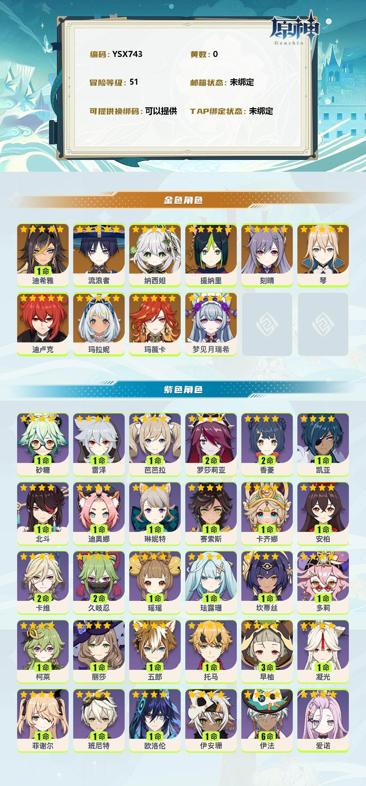 【YSX743】51级/女主/11个五星角色/0命梦见月瑞希/0命玛薇卡/0命玛拉妮/1命迪希雅/流浪者/纳西妲/提纳里/琴/刻晴/迪卢克/0命爱诺/满命伊法/1命伊安珊/1命欧洛伦/1命卡齐娜/0命赛索斯/0命琳妮特/2命卡维/0命瑶瑶/0命珐露珊/0命坎蒂丝/1命多莉/1命柯莱/2命久岐忍/0命五郎/0命托马/3命早柚/2命罗莎莉亚/1命迪奥娜/0命砂糖/0命雷泽/0命菲谢尔/0命丽莎/0命北斗/2命香菱/0命安柏/0命班尼特/1命芭芭拉/1命凝光/0命凯亚【按邮箱: 邮箱未绑定】