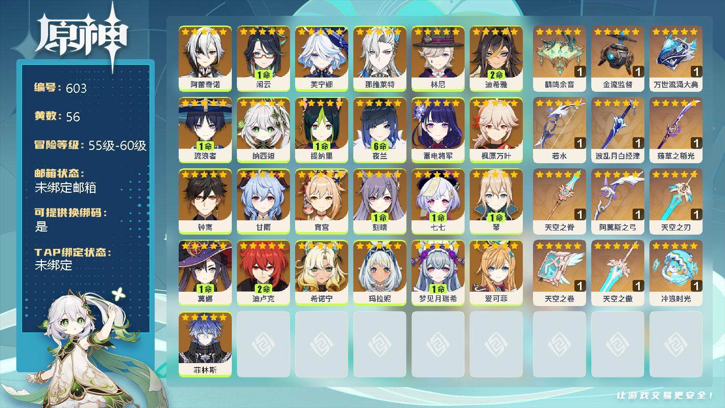 0命阿蕾奇诺,1命闲云,0命芙宁娜,0命那维莱特,0命林尼,2命迪希雅,1命流浪者,0命纳西妲,1命提纳里,满命夜兰,0命雷电将军,0命枫原万叶,0命钟离,0命甘雨,0命宵宫,1命刻晴,1命七七,1命琴,1命莫娜,2命迪卢克,0命希诺宁,0命玛拉妮,1命梦见月瑞希,0命爱可菲,0命菲林斯,精1鹤鸣余音,精1金流监督,精1万世流涌大典,精1若水,精1波乱月白经津,精1薙草之稻光,精1天空之脊,精1阿莫斯之弓,精1天空之刃,精1天空之卷,精1天空之傲,精1冲浪时光【按邮箱: 邮箱未绑定】