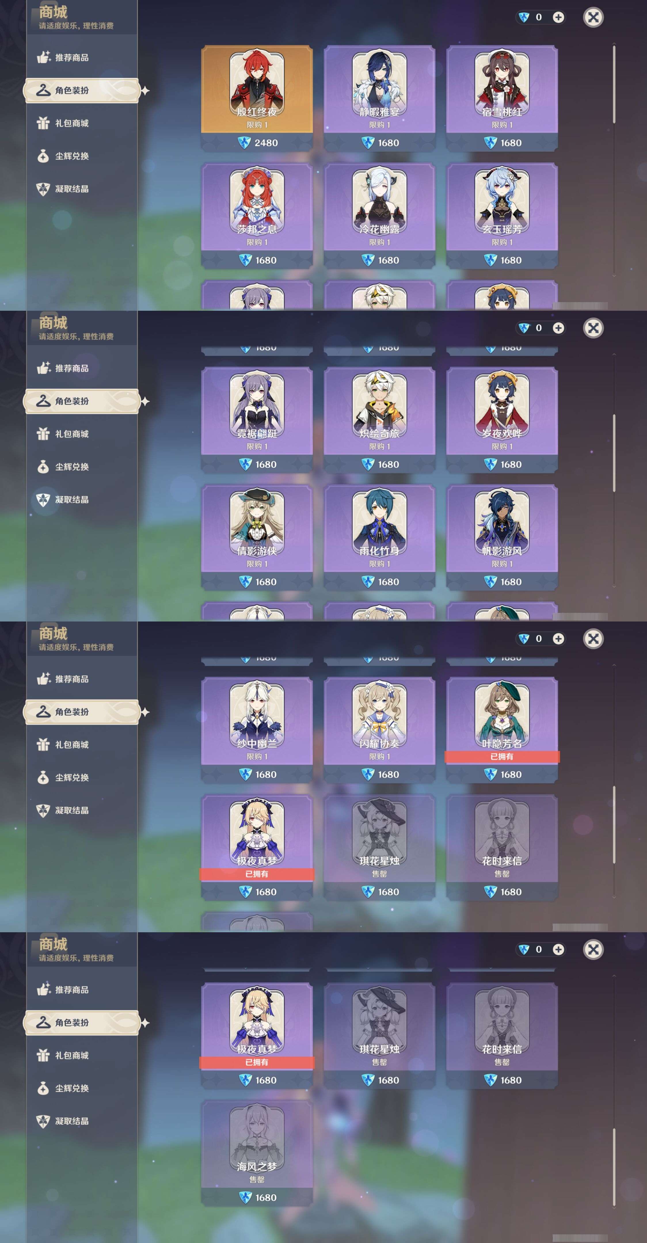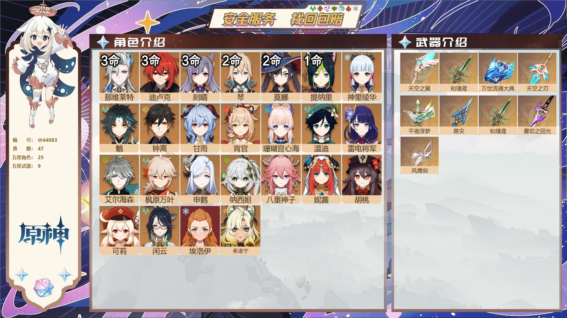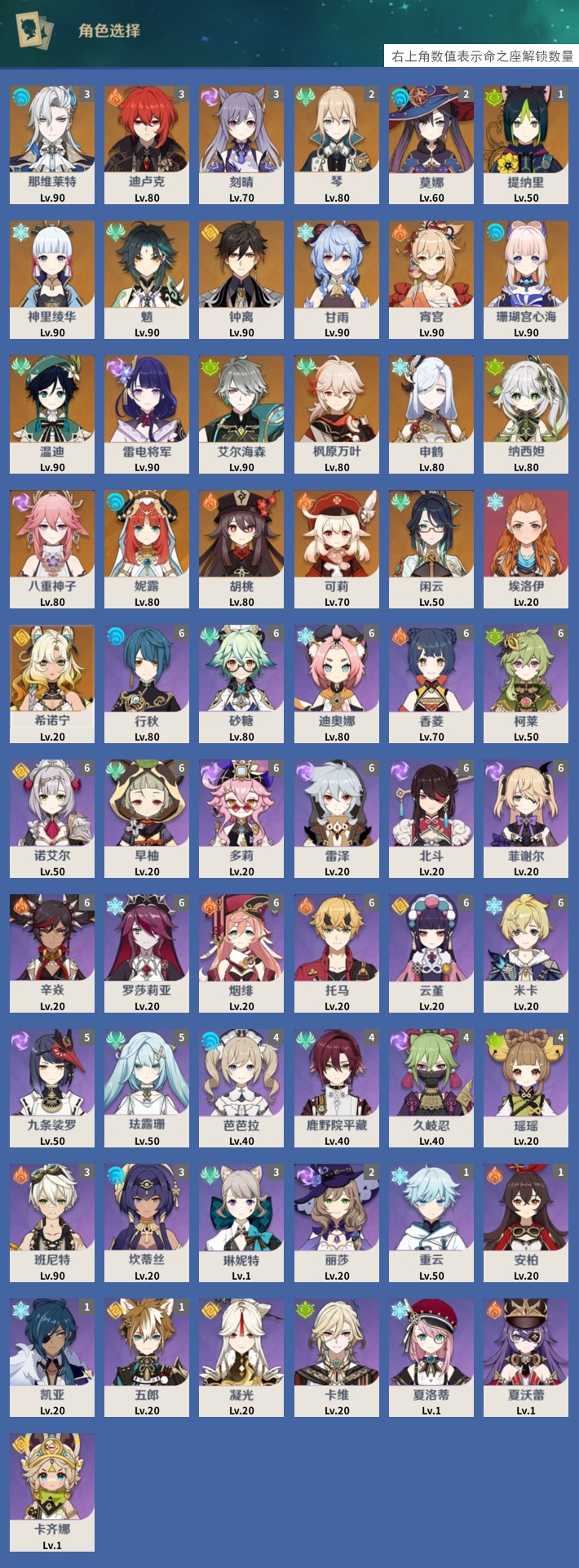 【25个五星角色】,3命那维莱特,3命迪卢克,3命刻晴,2命琴,2命莫娜,1命提纳里,0命神里绫华,0命魈,0命钟离,0命甘雨,0命宵宫,0命珊瑚宫心海,0命温迪,0命雷电将军,0命艾尔海森,0命枫原万叶,0命申鹤,0命纳西妲,0命八重神子,0命妮露,0命胡桃,0命可莉,0命闲云,0命埃洛伊,0命希诺宁,