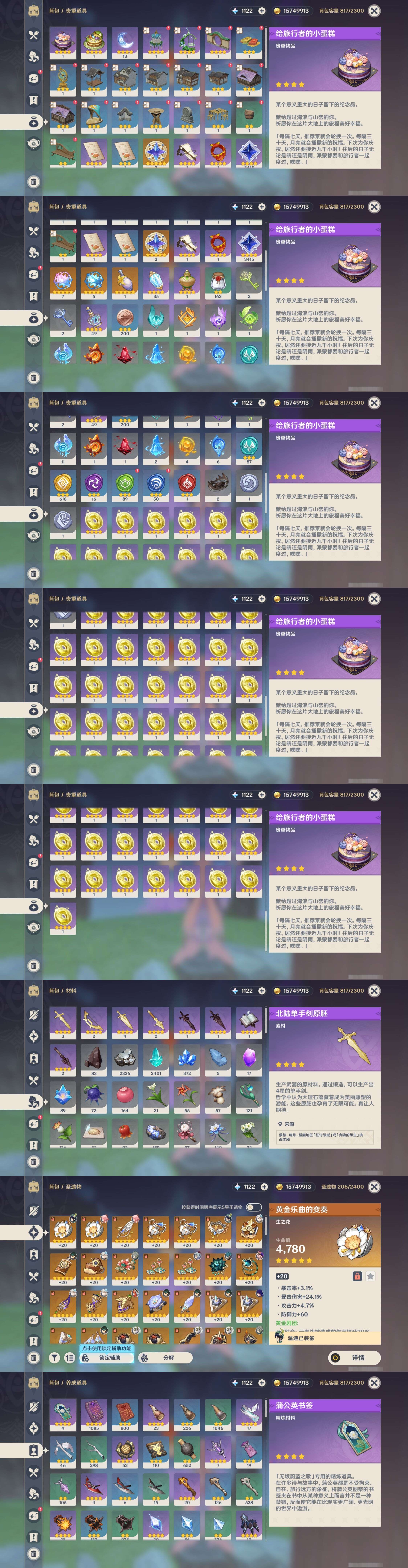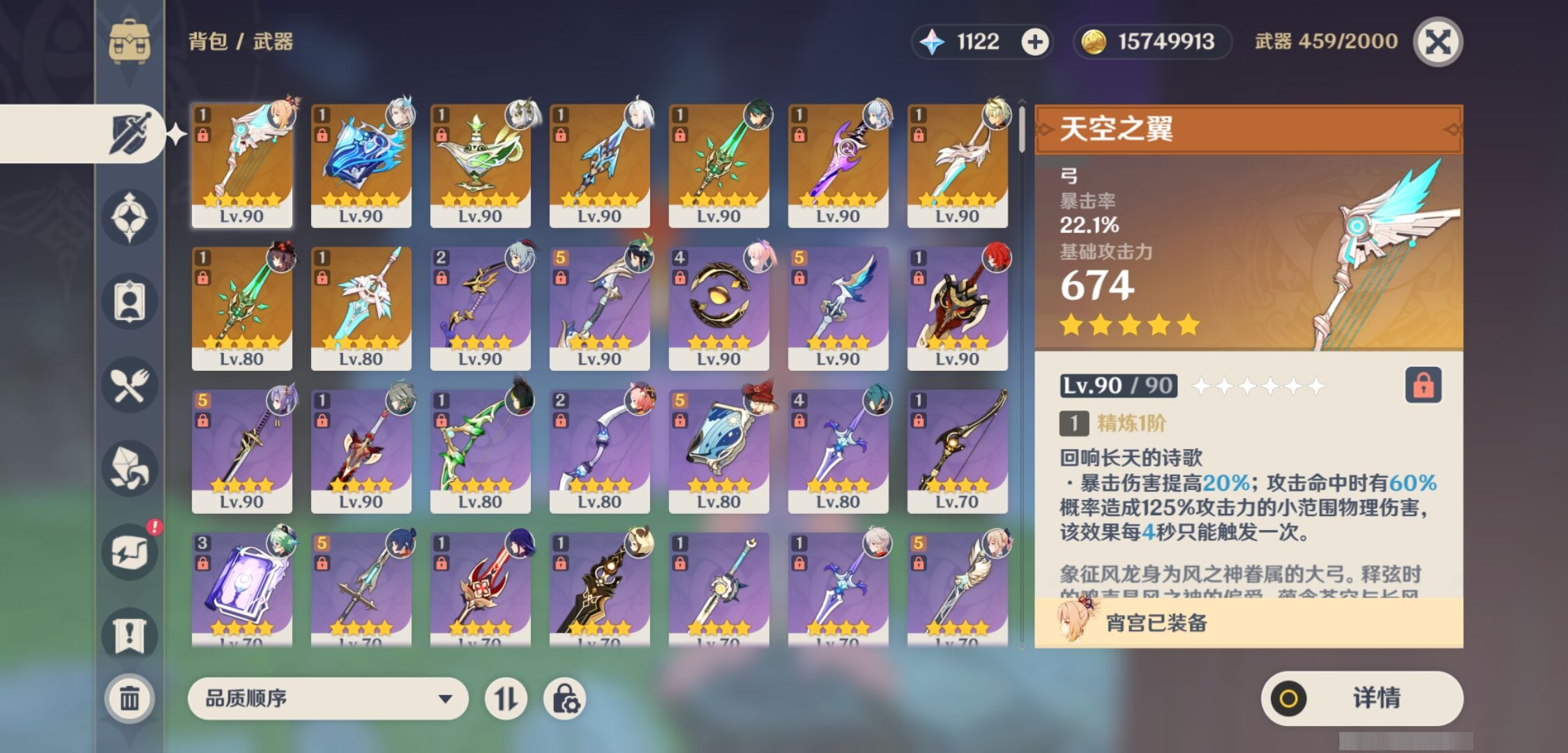 【9个五星武器】,精1天空之翼,精1和璞鸢,精1万世流涌大典,精1天空之刃,精1千夜浮梦,精1息灾,精1和璞鸢,精1雾切之回光,精1风鹰剑,